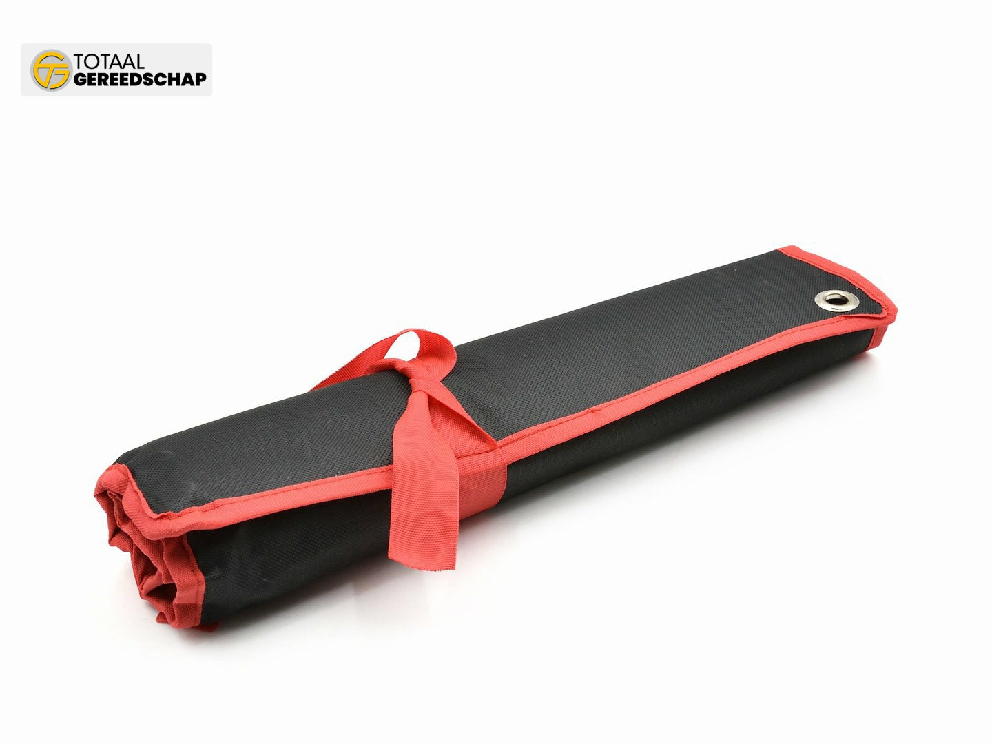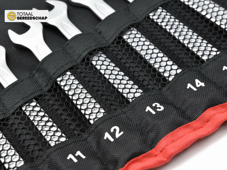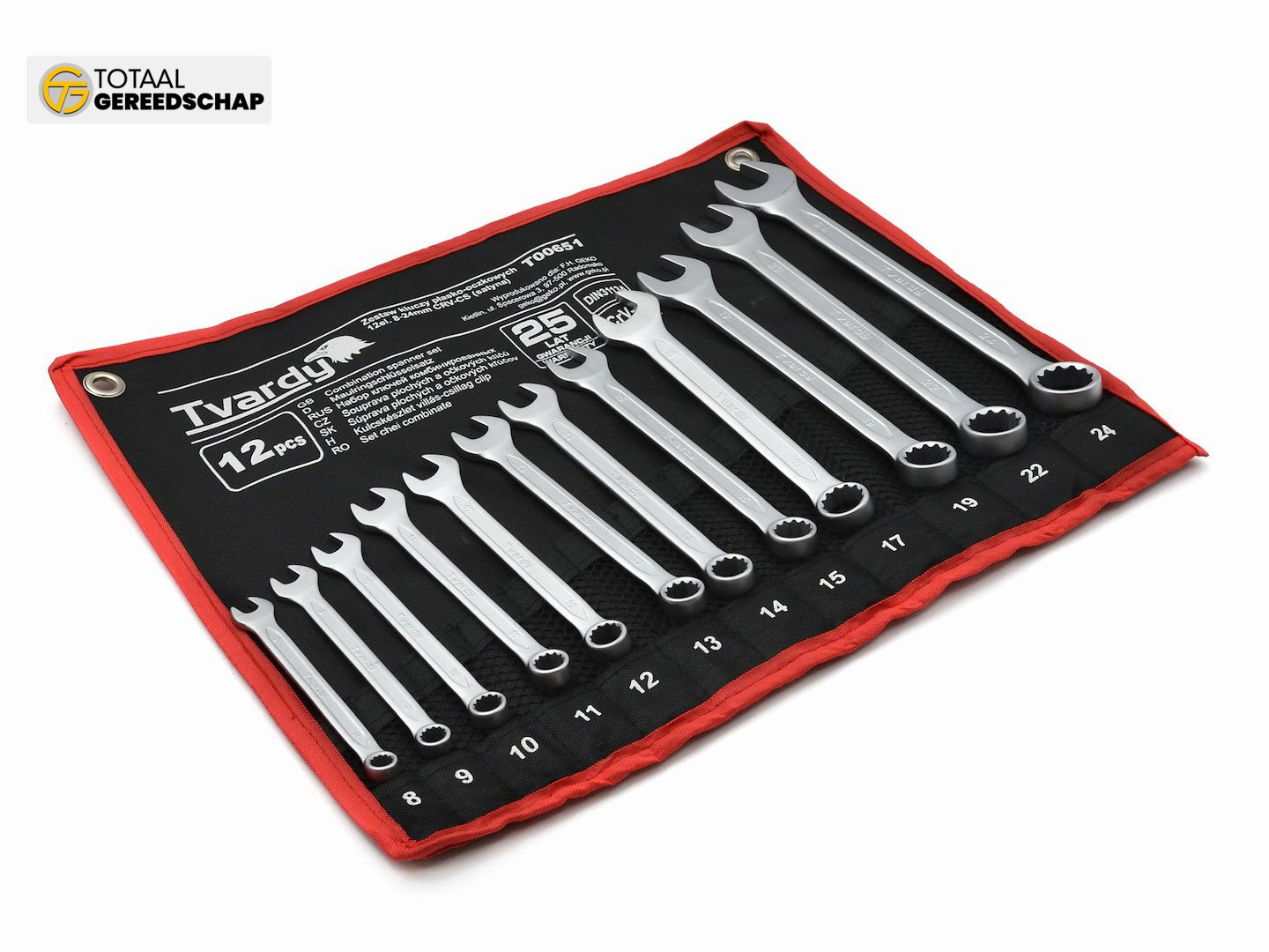 The set includes 12 wrenches in sizes 8-24mm and a durable sheet with reinforced eyelets allowing it to be hung on the wall.