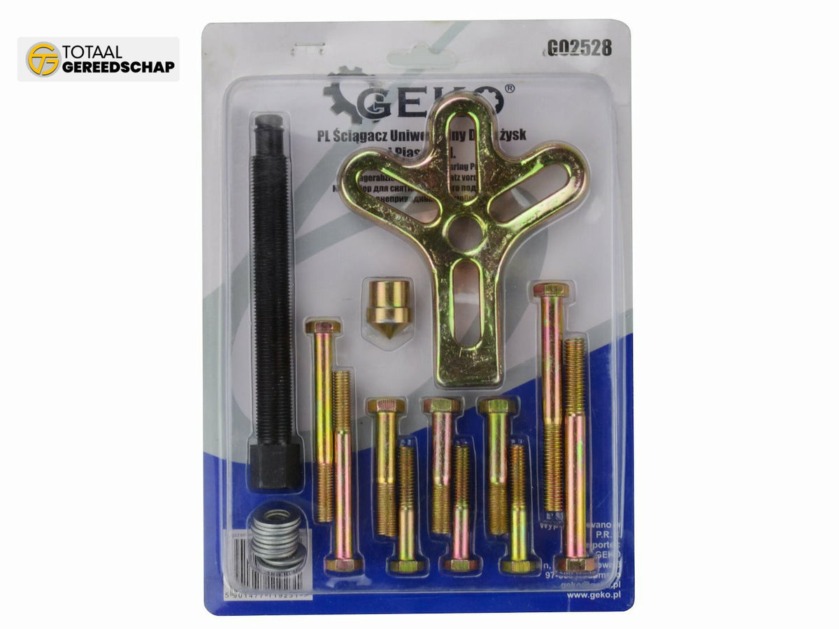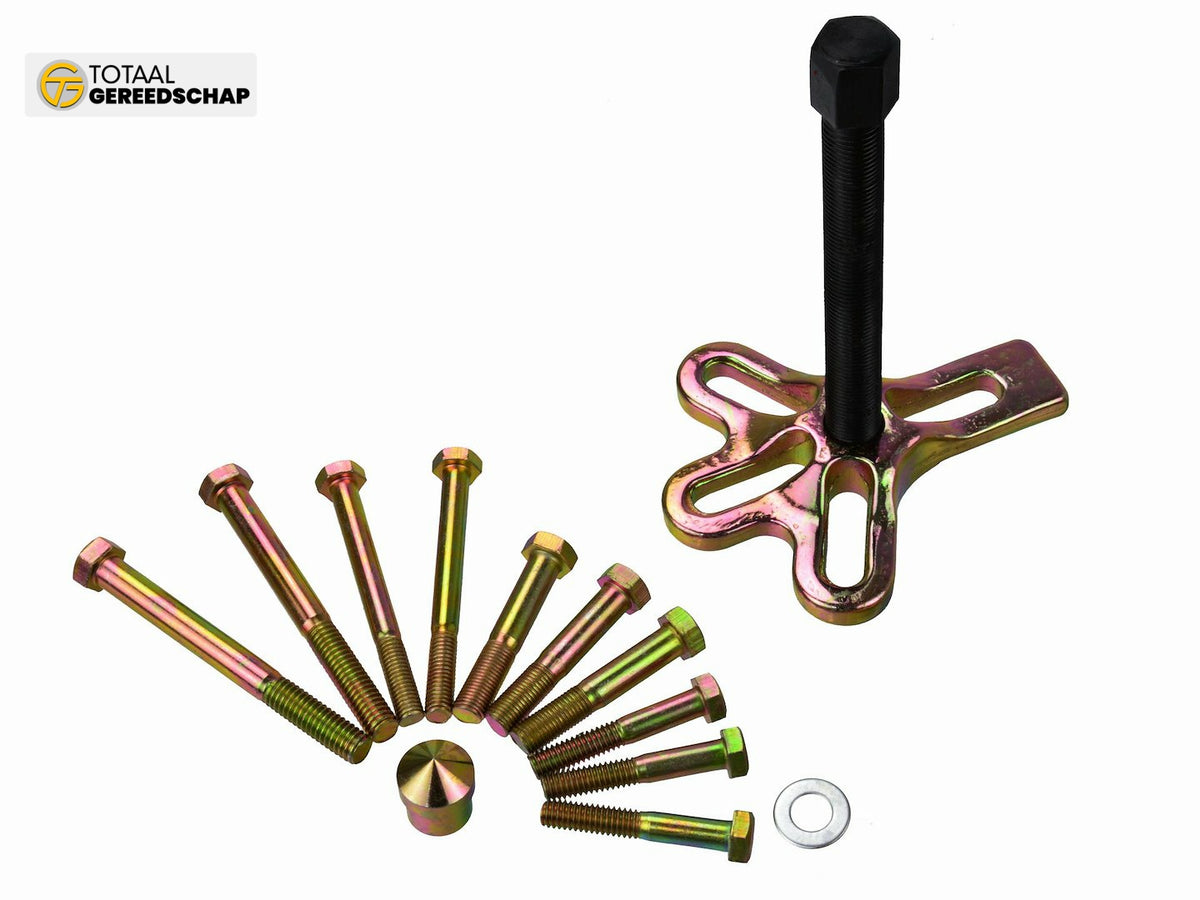 Professional hub and bearing puller. The set is made of the highest quality forged steel. The puller provides even pressure preventing damage to the parts.