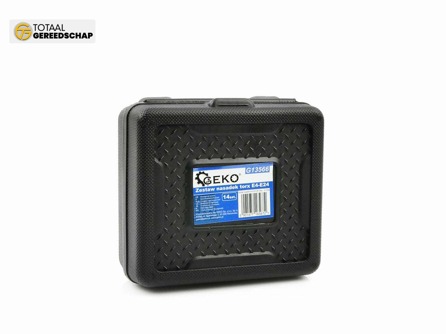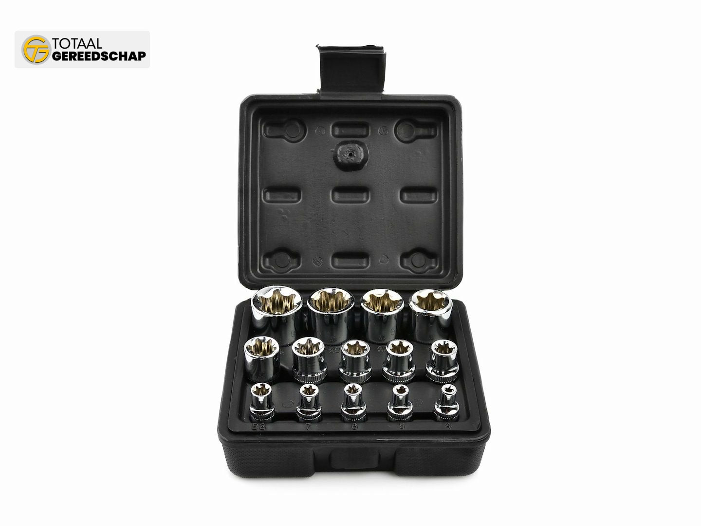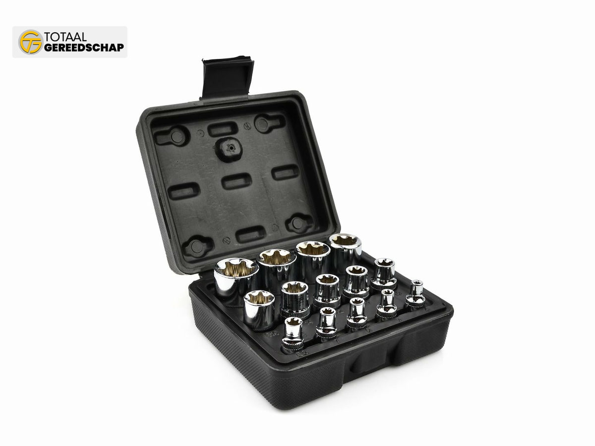 External Torx Sockets Set made of Chromium-vanadium (Cr-V) steel. Set includes 1/4 in. drive E-Torx sockets: E-4, E-5, E-6, E-7, E-8, 3/8 in. drive E-Torx sockets: E-10, E-11, E-12, E-14, E-16 and 1/2 in. drive E-Torx sockets: E-18, E-20, E-22, E-24. The whole set is packed in a handy plastic case.