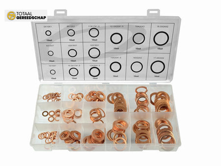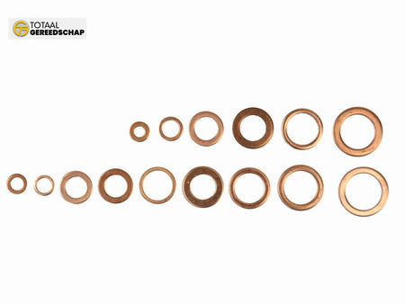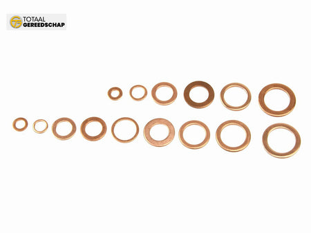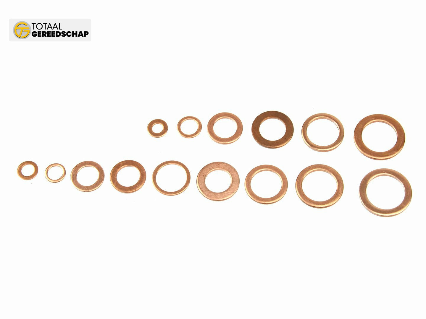 150 pcs flat washers set made of copper. Copper washers are corrosion-resistant in wet environments, nonmagnetic, and electrically conductive.