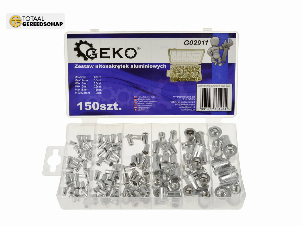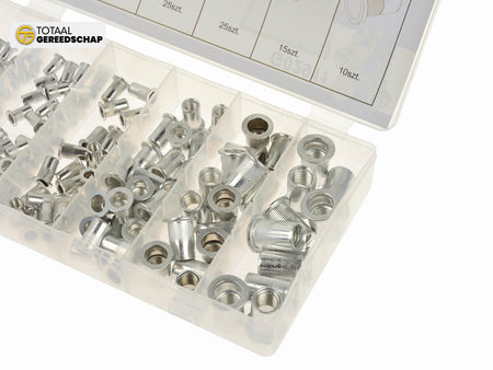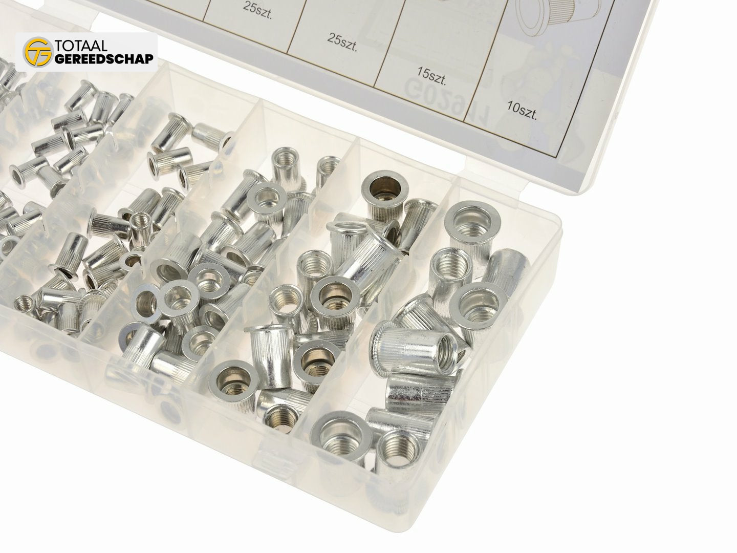 150 pc Aluminium Rivet Nuts Assortment in 6 popular sizes M3 - M10. Compatible with fittings of the proper thread size.