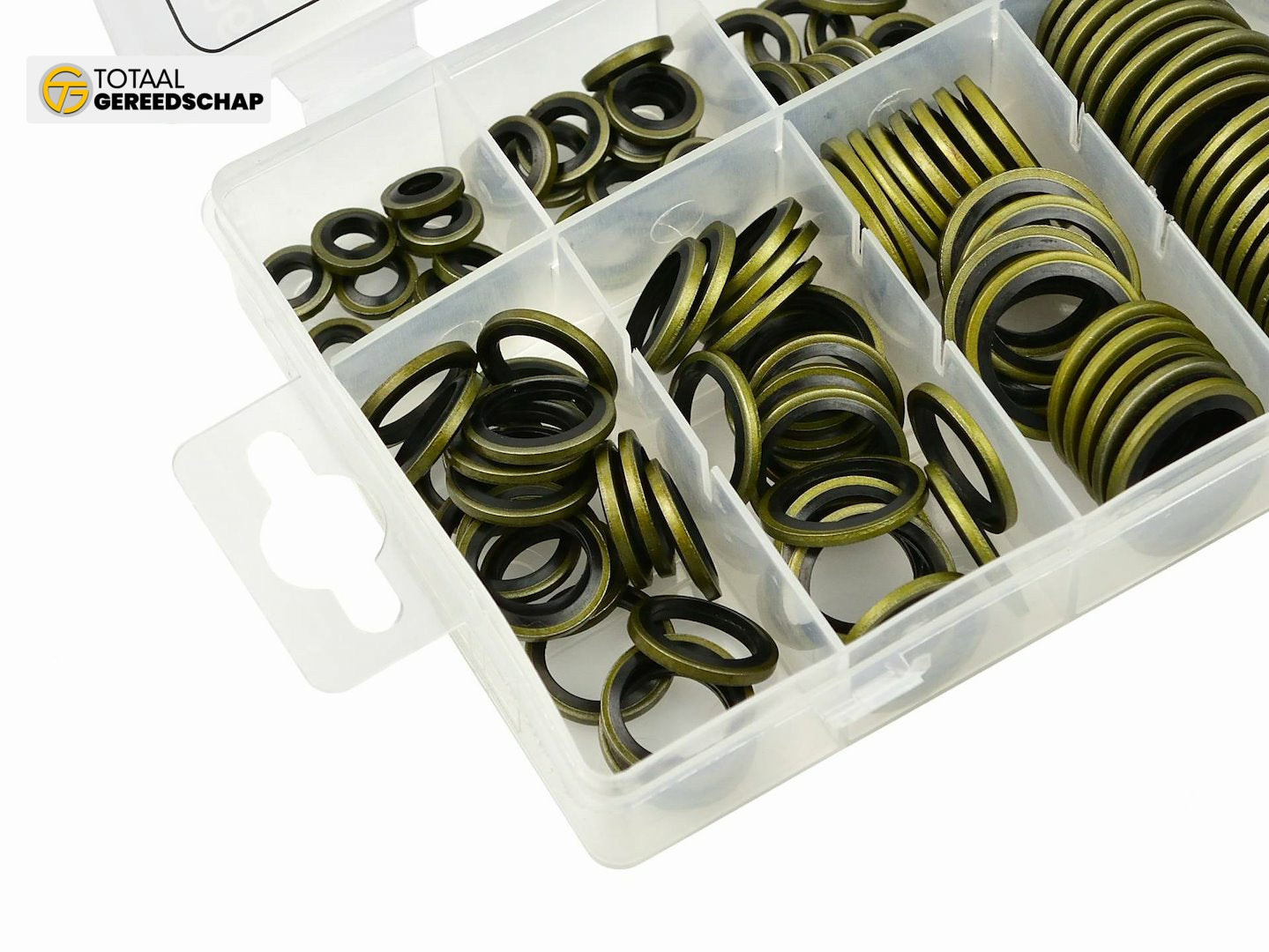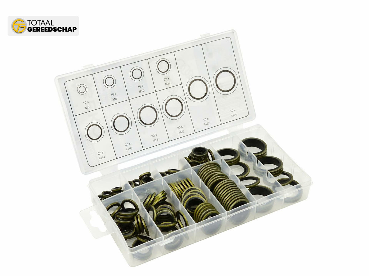Set of metal-rubber washers in sizes from M6 to M24. Used for sealing threaded joints. Made of steel and NBR rubber. Self-centering washers ensure tight adhesion of rubber to the thread and excellent sealing of threaded connections.