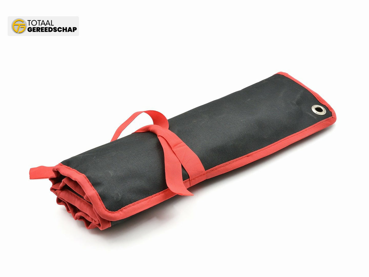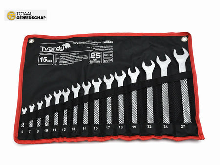 The set includes 15 wrenches in sizes 6-27mm and a durable sheet with reinforced eyelets allowing it to be hung on the wall.