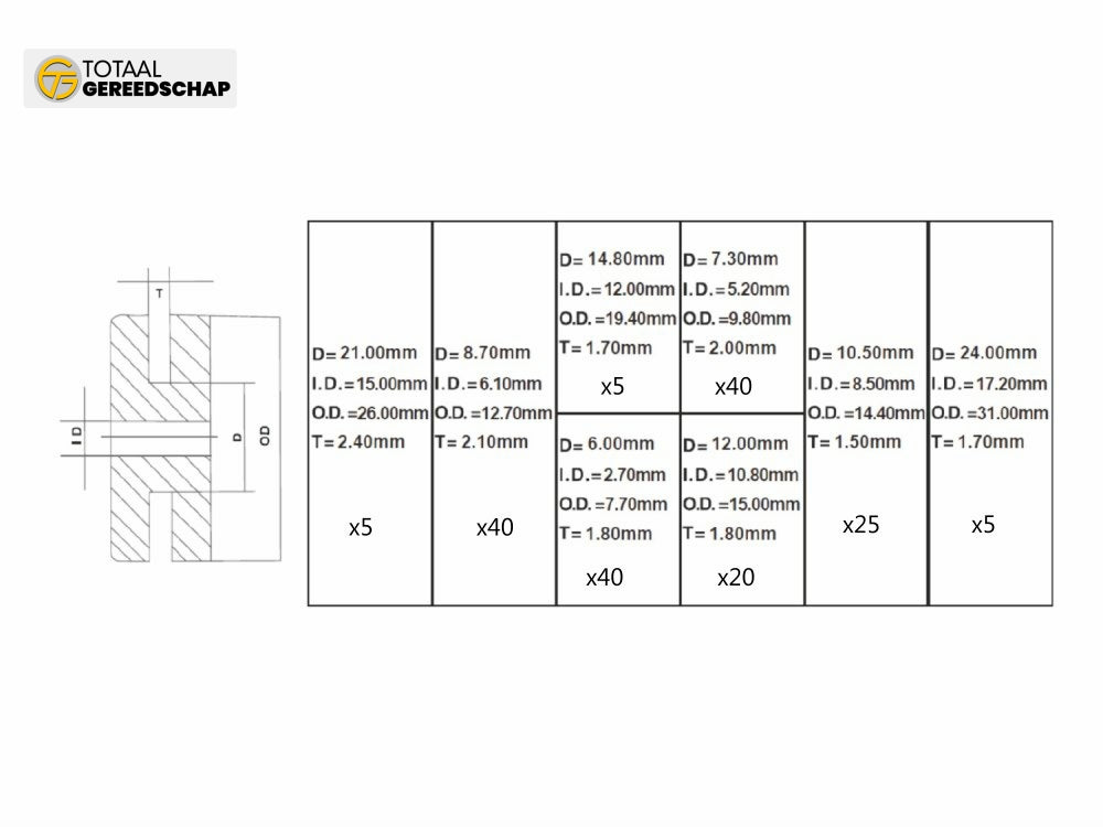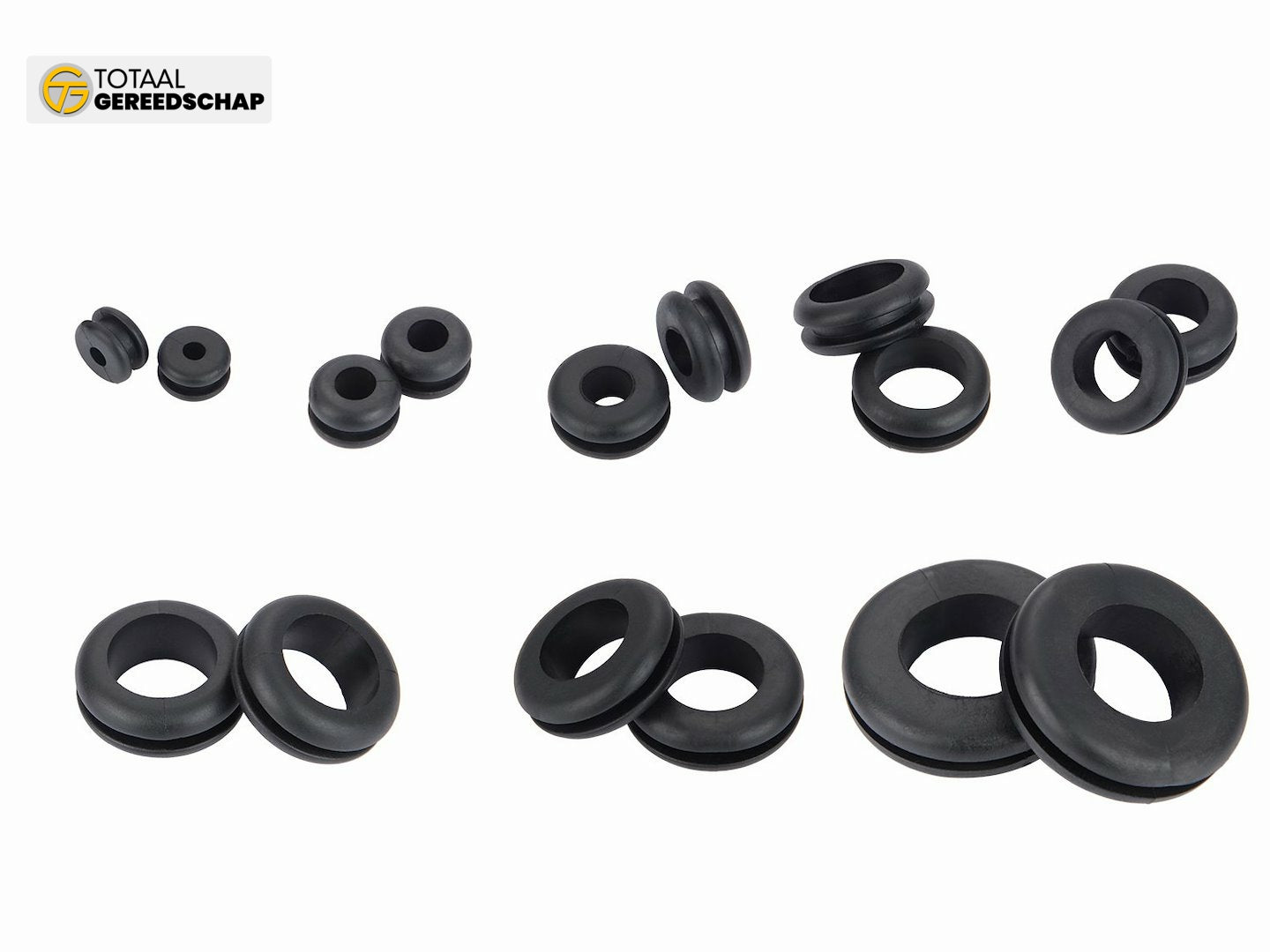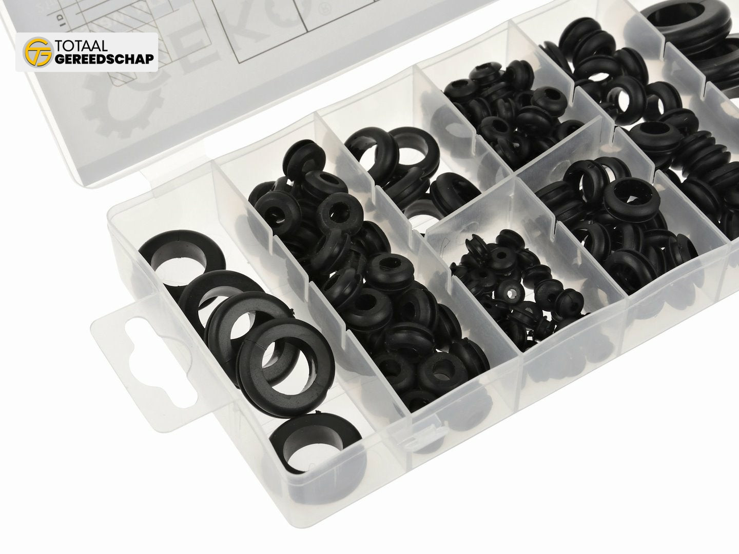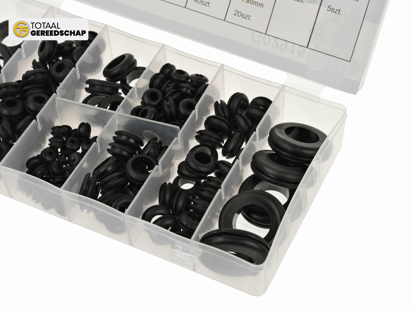 180pcs Rubber Grommets Assortment Set commonly used to protect or cover holes and to protect cables or wires from sharp corners or edges. Fits Hole size: 6, 7.3, 8.7, 10.5, 12, 14.8, 21 and 24mm.
