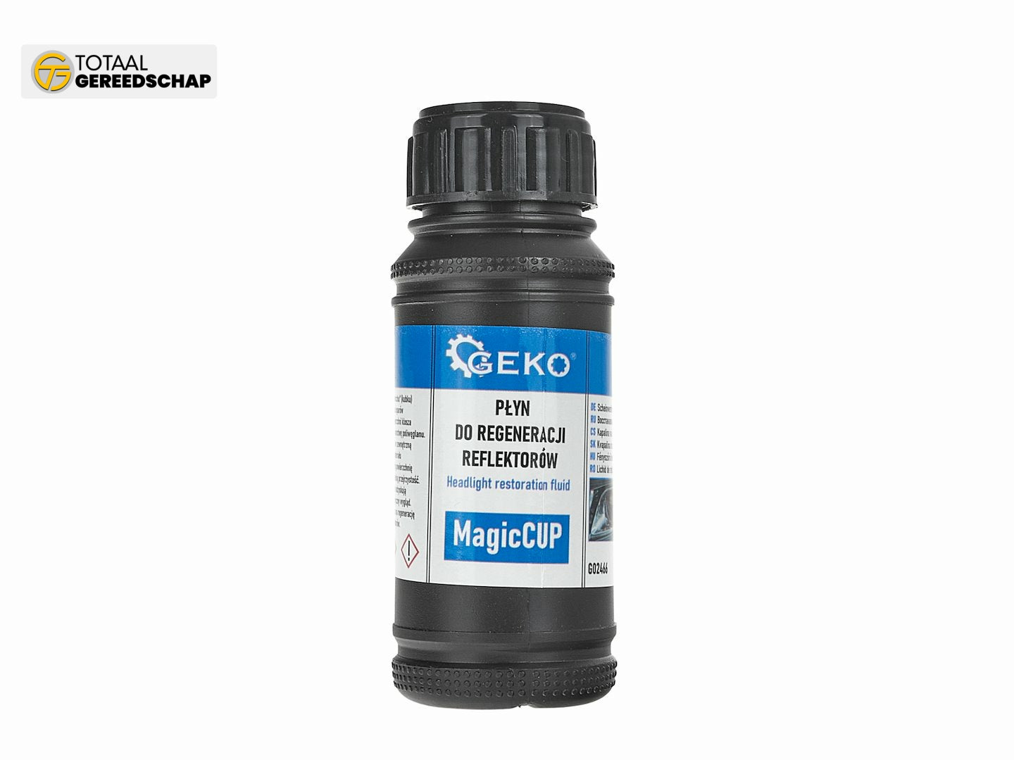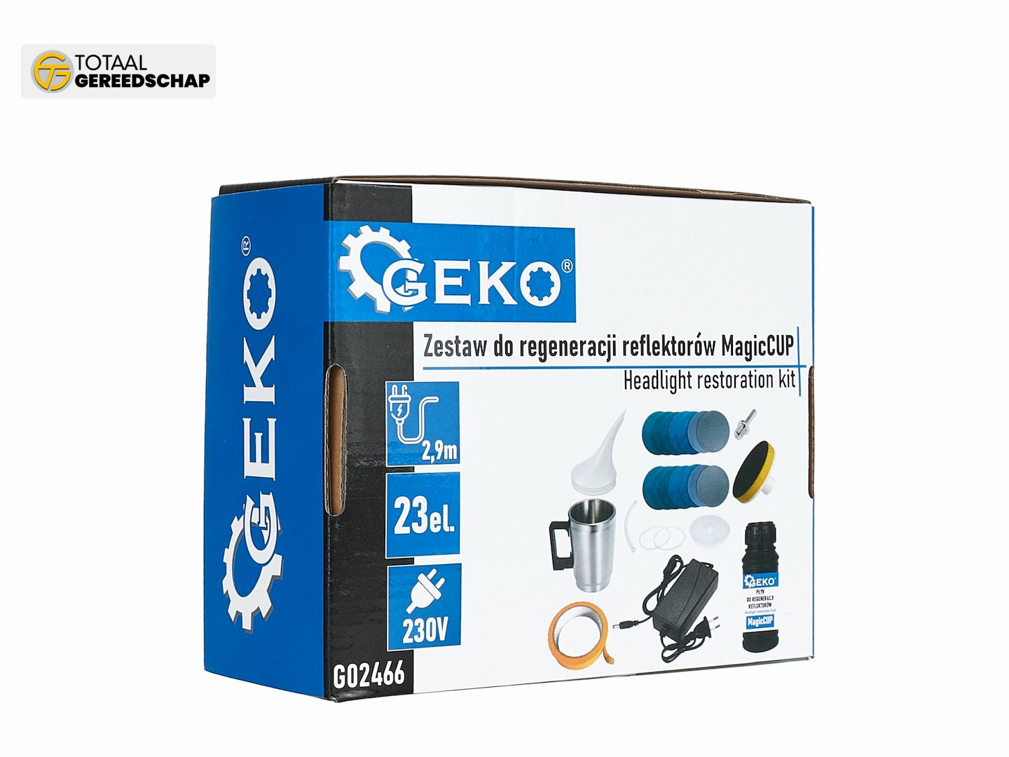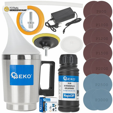 MagicCUP 23-Piece Headlight Restoration Kit is a comprehensive tool designed for professional renovation and restoration of car headlights' clarity. The GEKO brand product effectively removes dullness, scratches, and discoloration from headlights, restoring their original transparency and improving the vehicle's aesthetics. MagicCUP is the perfect solution for both professionals and DIY enthusiasts.