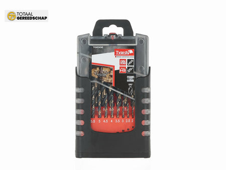 Set of 5 pieces of gold-black metal drill bits 1.0-13.0 mm made of 4341 HSS high-speed steel, coated with TiN (titanium nitride). Drill bits comply with DIN 338 standard. Cylindrical shank.