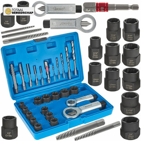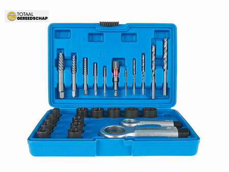 26 components included, such as sockets, drill bits, extractors, an adapter, and nut splitters