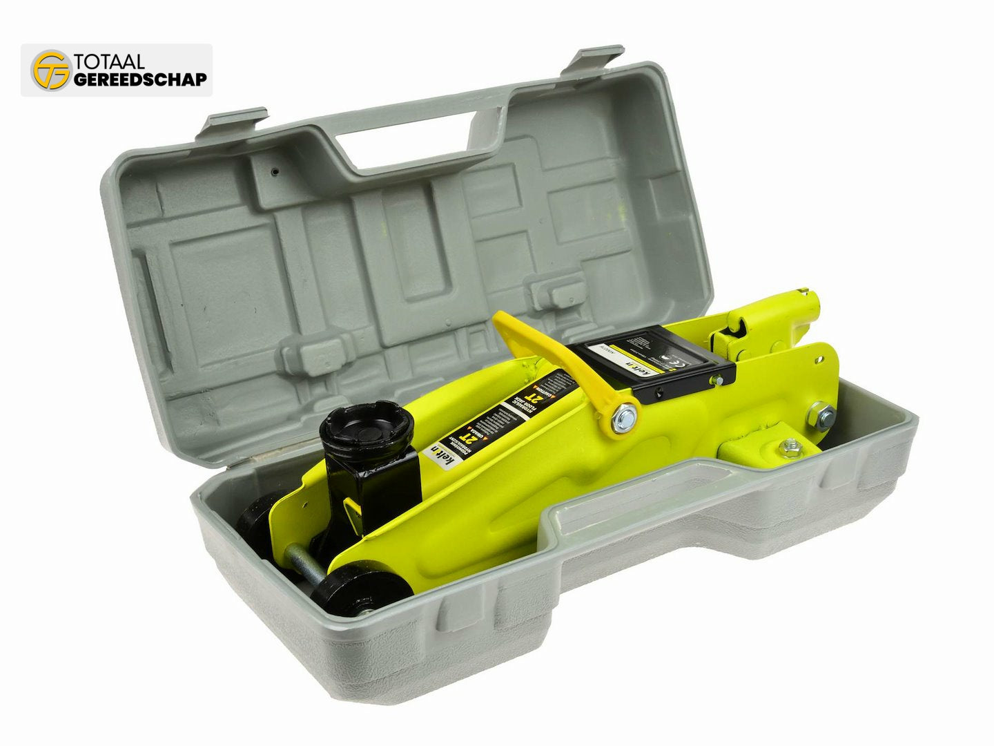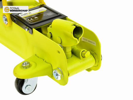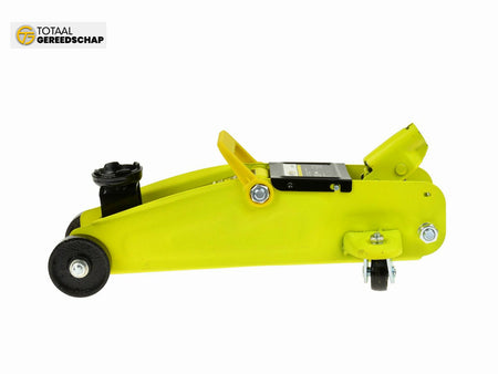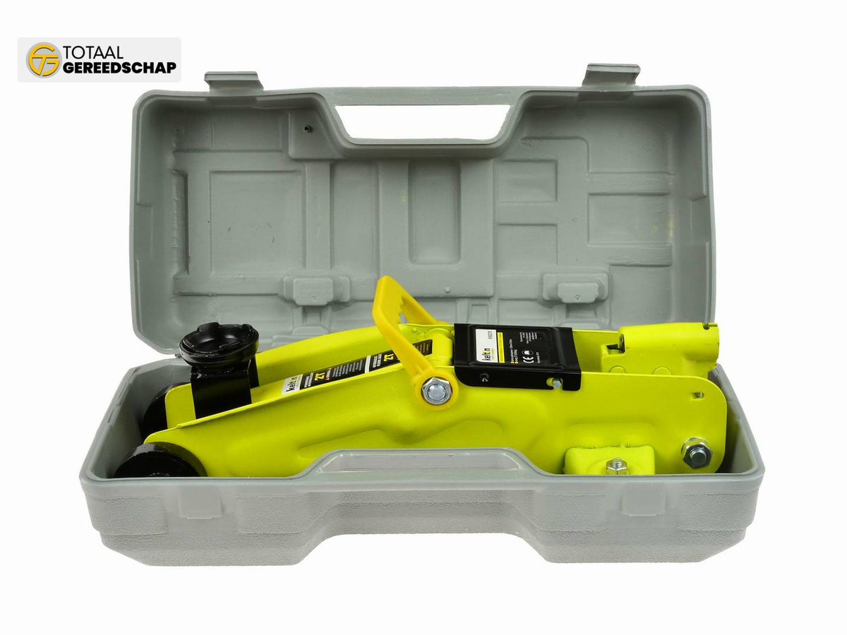 Mobile hydraulic jack with a maximum load capacity of 2 tons. Equipped with steel wheels and a carrying handle. Perfectly suited for a home garage. Product packed in a durable and easy-to-carry plastic case.