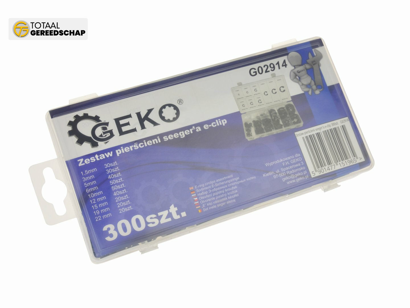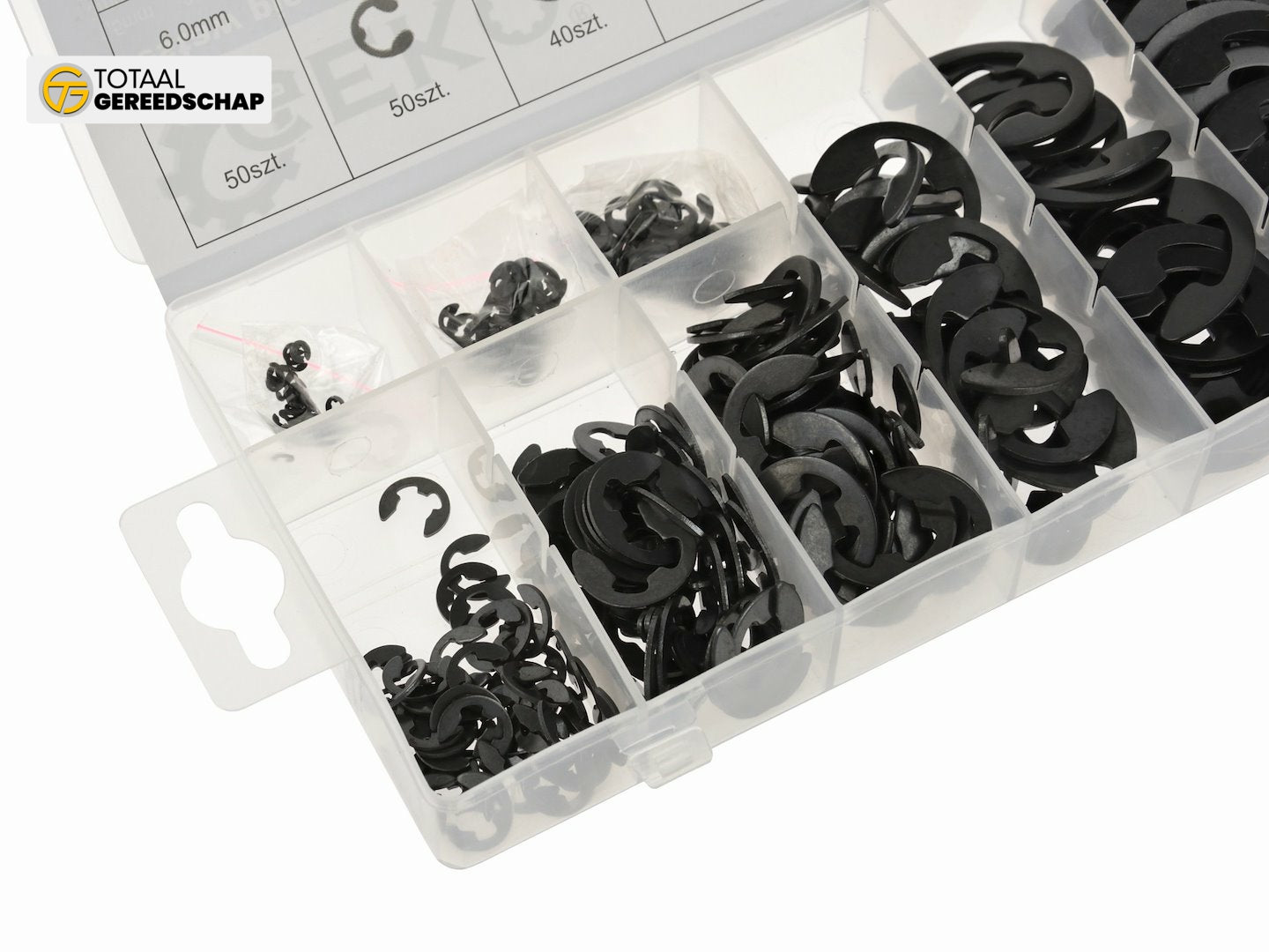 E-Clip Stainless Steel External Retaining Ring Assortment Set. Set includes 300pcs of 9 most-used sizes: 1.5, 3, 5, 6, 10, 12, 15, 19, 22 mm. Organized by size in a transparent storage case for quick access and protection.