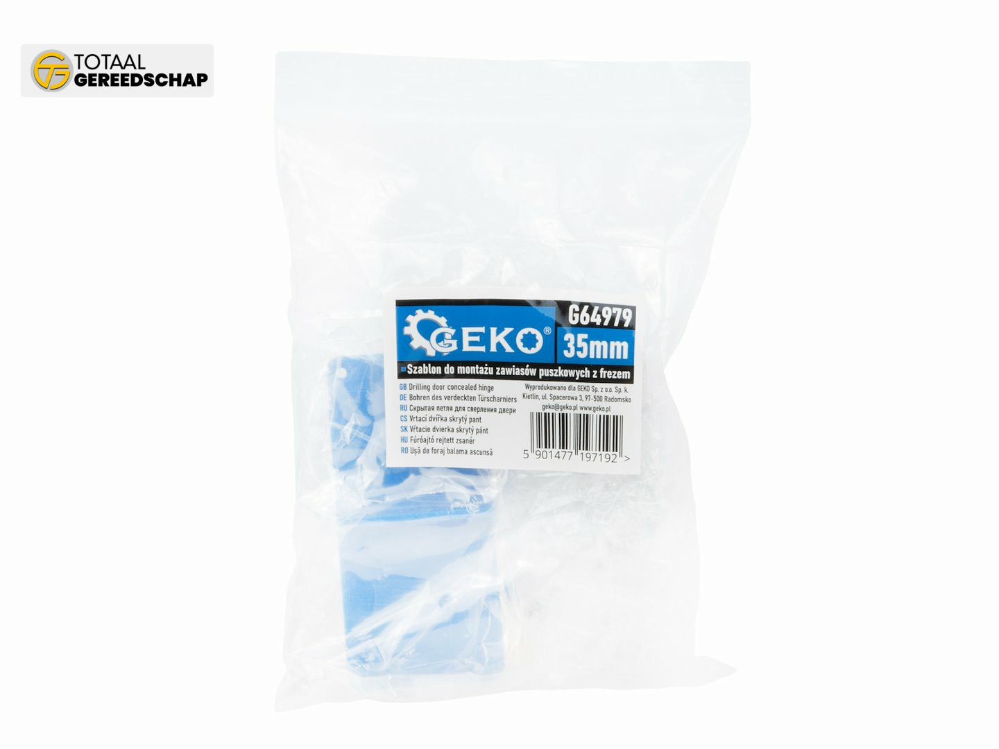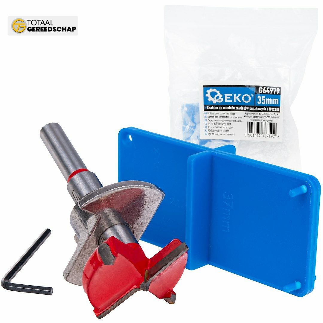 Manufacturer: Geko Cutter diameter: 35 mm (standard size for furniture hinge cups) Depth adjustment: Yes Carbide-tipped (cemented carbide): ensures high durability and precision. Cutter centering point: Precise, facilitating accurate drilling of the hole. Application: Installation of concealed hinges Set contents: