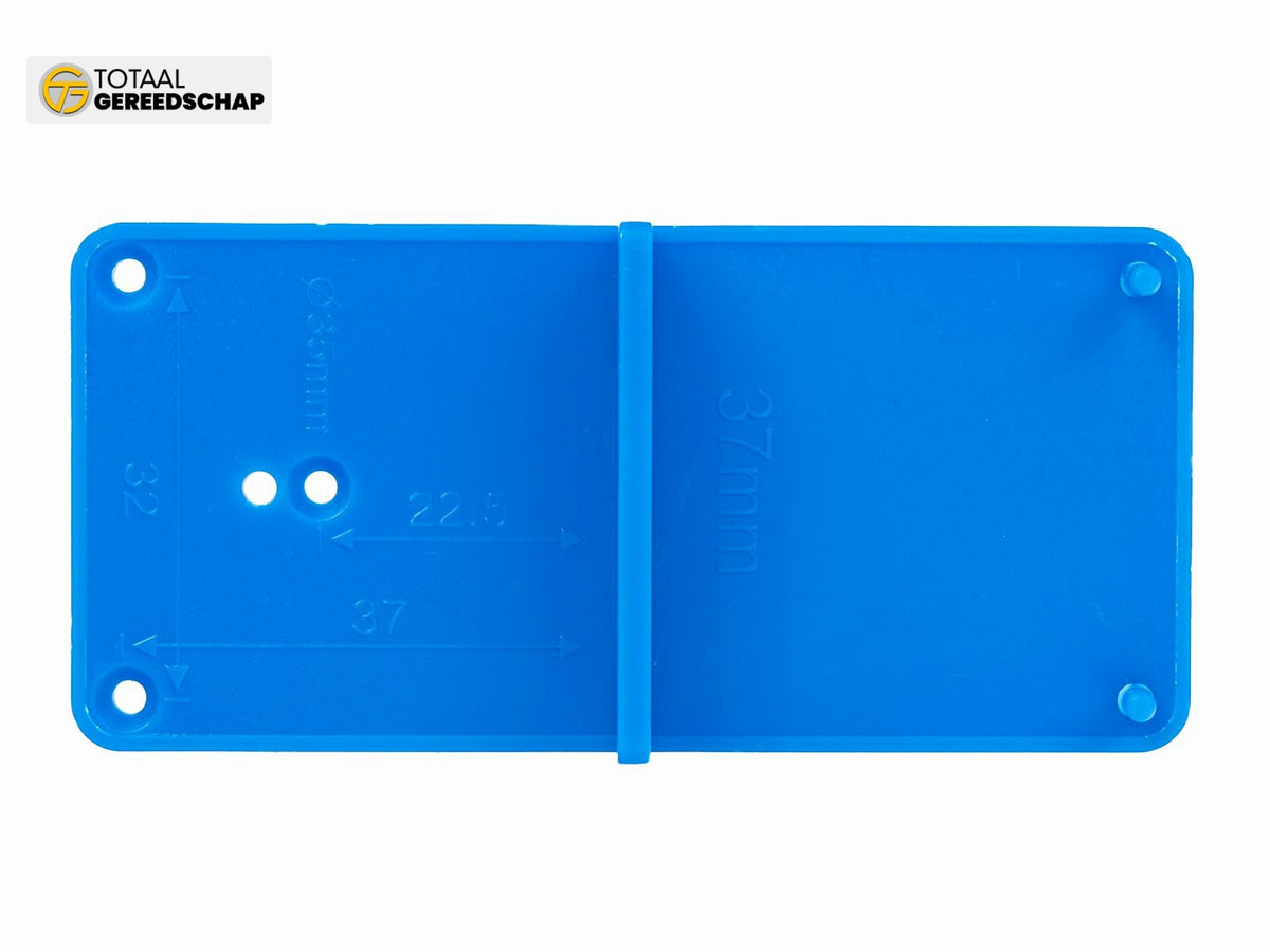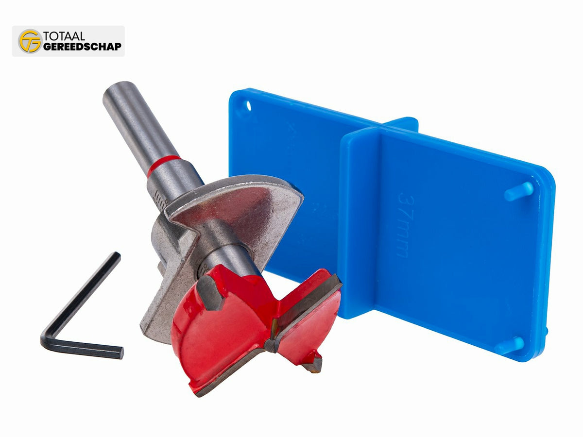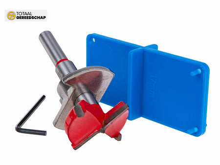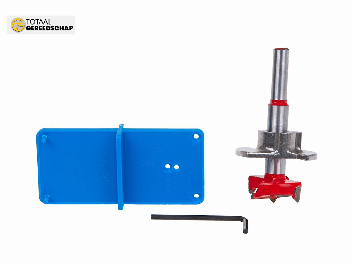 Quick installation: Thanks to the template, installation becomes much simpler and faster, saving you time and hassle. 35mm cutter: The set includes a standard 35mm cutter, suitable for most furniture hinge cups. Depth adjustment: The cutter has a drilling depth adjustment, allowing it to be adapted to different material thicknesses. Solid construction: The carbide-tipped cutter with cemented carbide blades and a precise centering point ensures durability and accuracy. Complete set: The set includes everything you need: a template, a 35mm adjustable cutter, and an Allen key for adjusting the drilling depth stop. Versatility: The set fits all hinges offered by us.