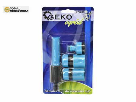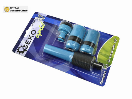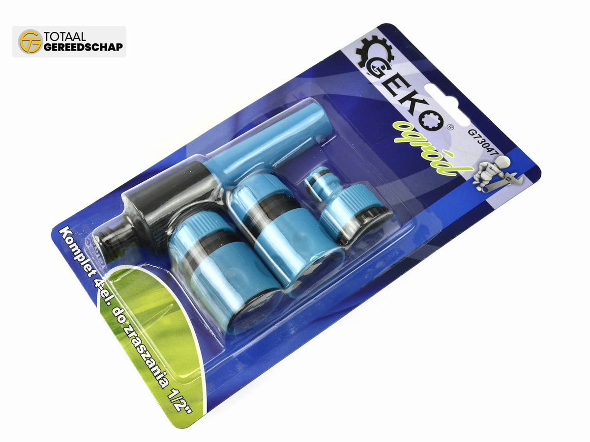 BLUE LINE 4-piece sprinkler set designed for hose with diameter 1/2”. The set includes a straight sprinkler nozzle, two 1/2” quick connectors (one with a stop), and a 3/4” faucet connector with a reduction to 1/2”.