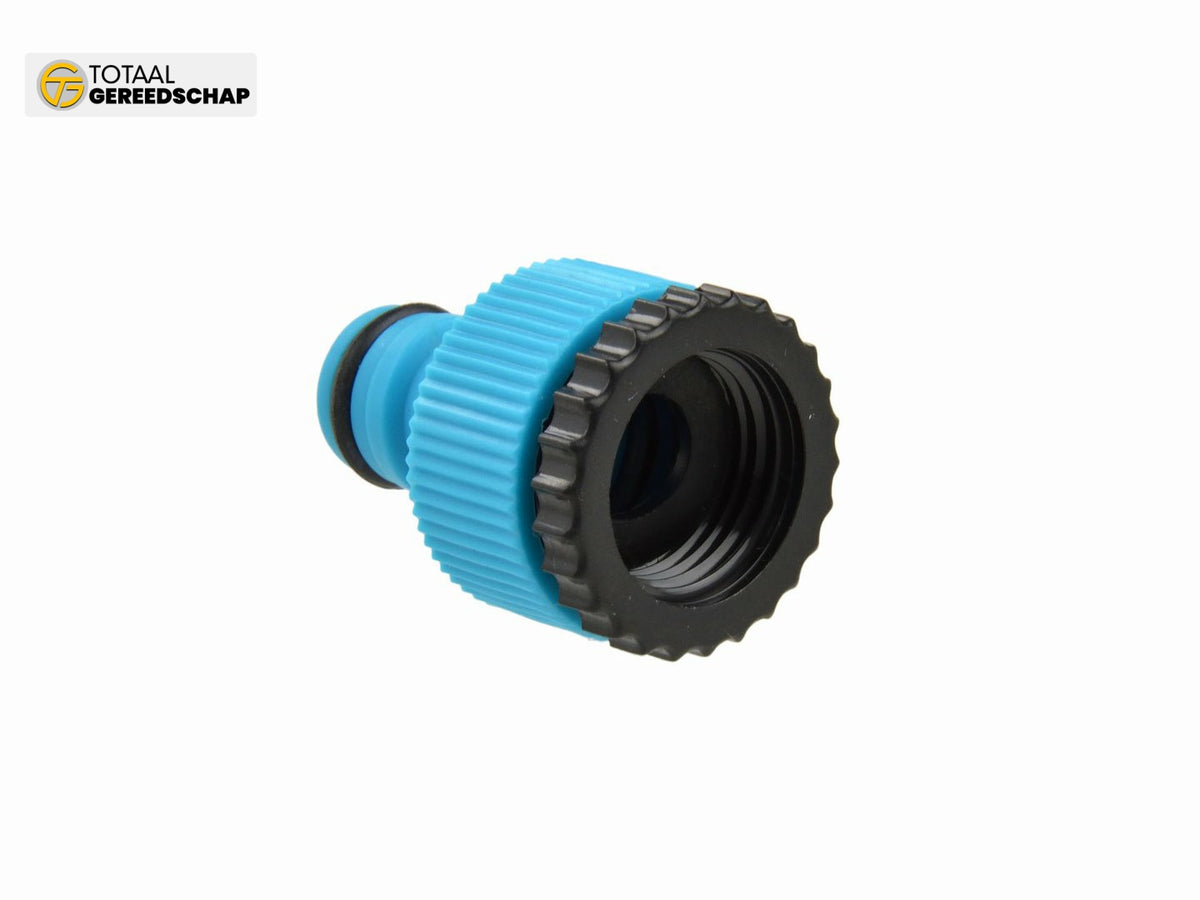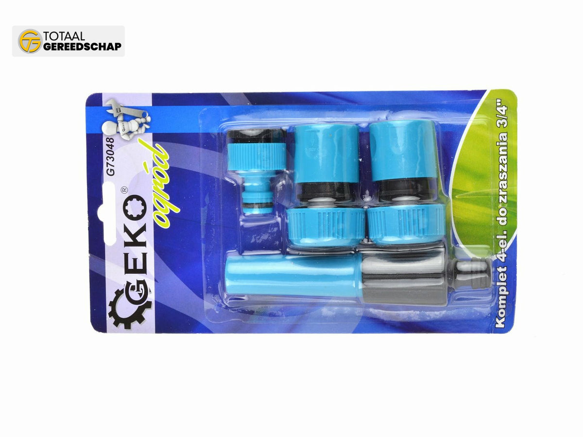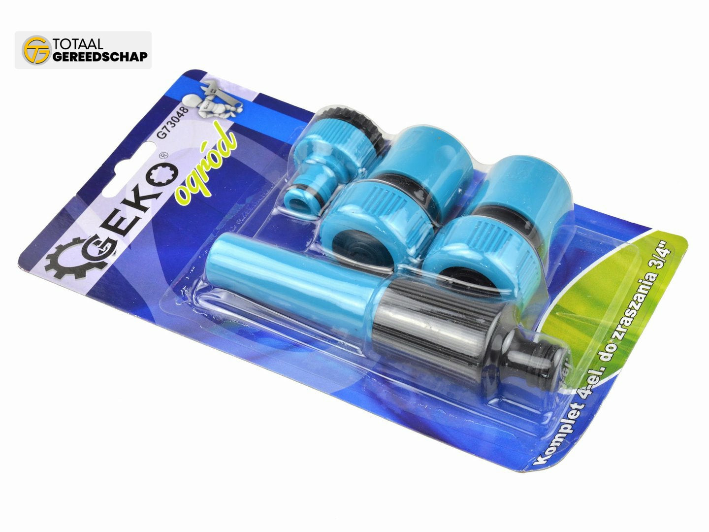 BLUE LINE 4-piece sprinkler set designed for hose with diameter 3/4”. The set includes a straight sprinkler nozzle, two 3/4” quick connectors (one with a stop), and a 3/4” faucet connector with a reduction to 1/2”.