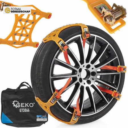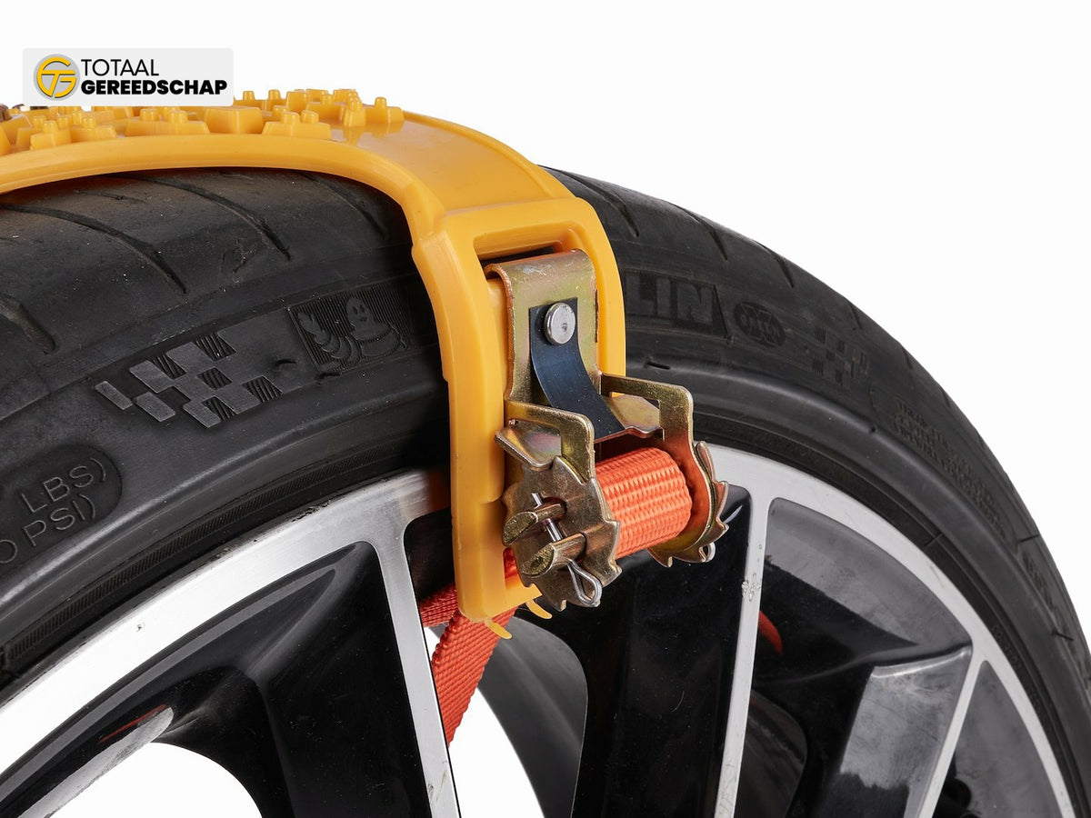 - Package Contents: 6 antiskid wheel covers, tensioner key, strap-pulling hook, work gloves, nylon storage bag.