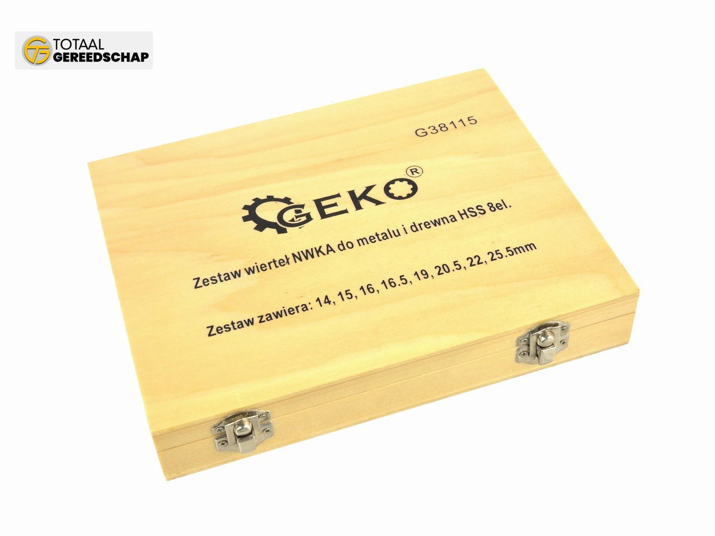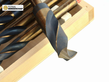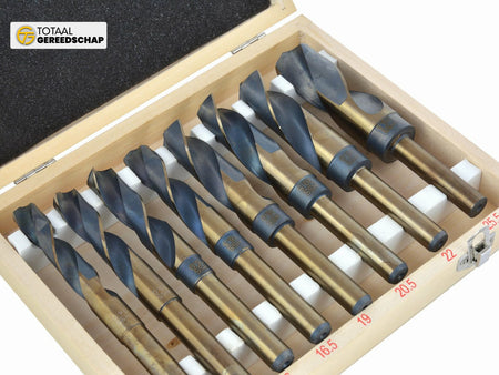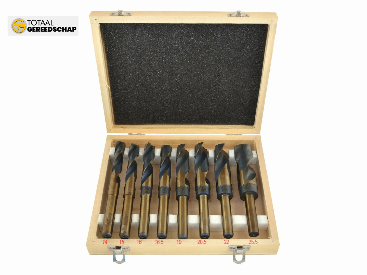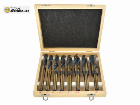 Set of NWKa twist drills with cylindrical shank. The set includes drill bits in sizes 14, 15, 16, 16.5, 19, 20.5, 22, 25.5 mm.