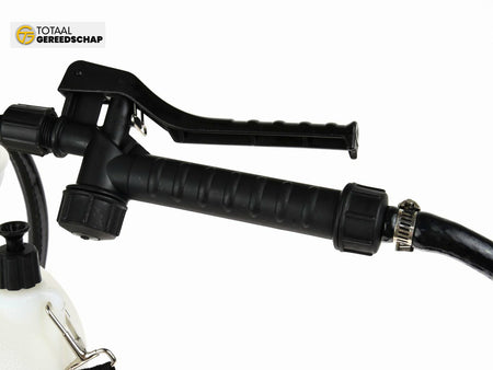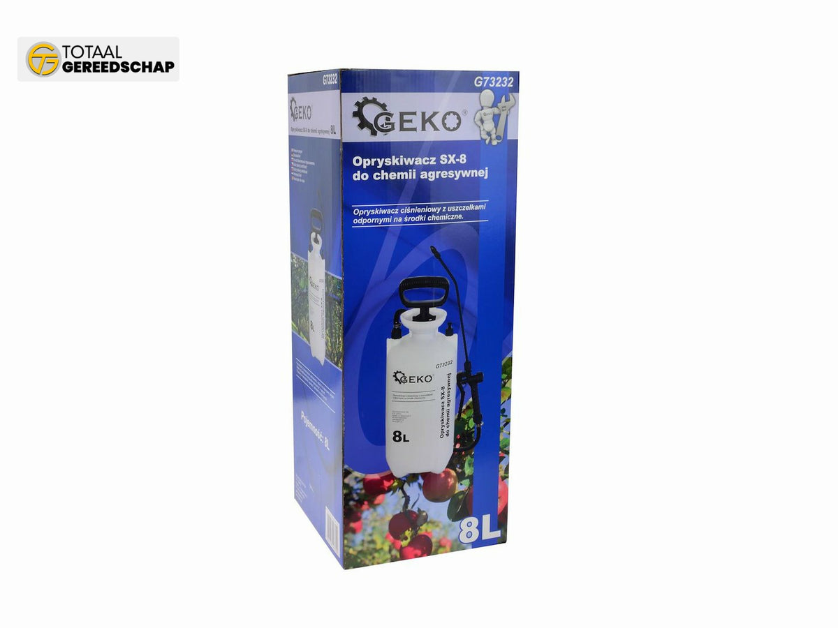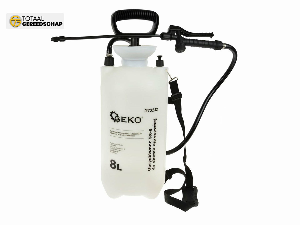Handheld pressure sprayer with a capacity of 8 liters. Made of high-quality plastics suitable for contact with aggressive chemicals (acids, bases).