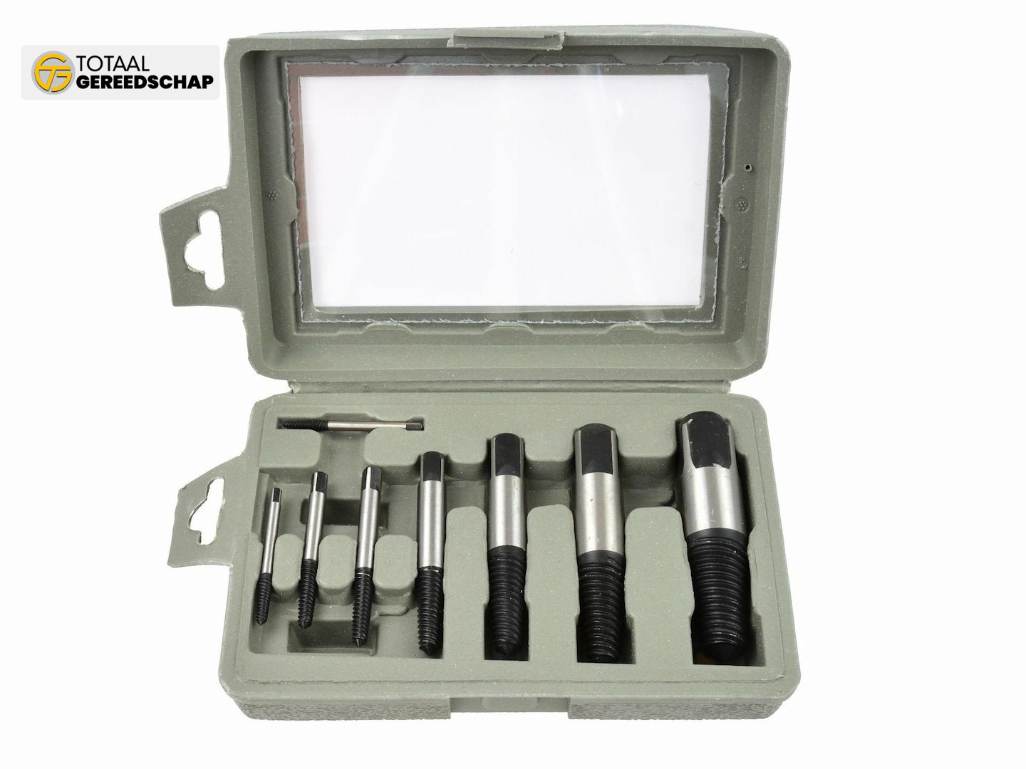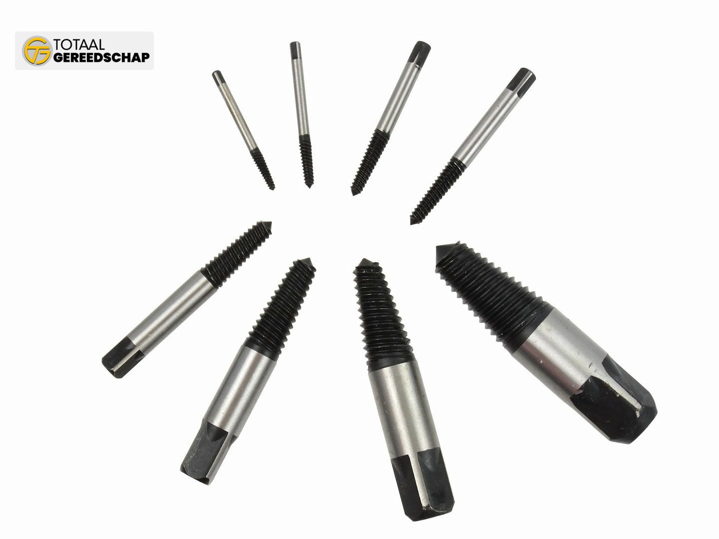 Set of 8 screw extractors of various sizes designed for removing broken or otherwise damaged screws, studs, etc.
