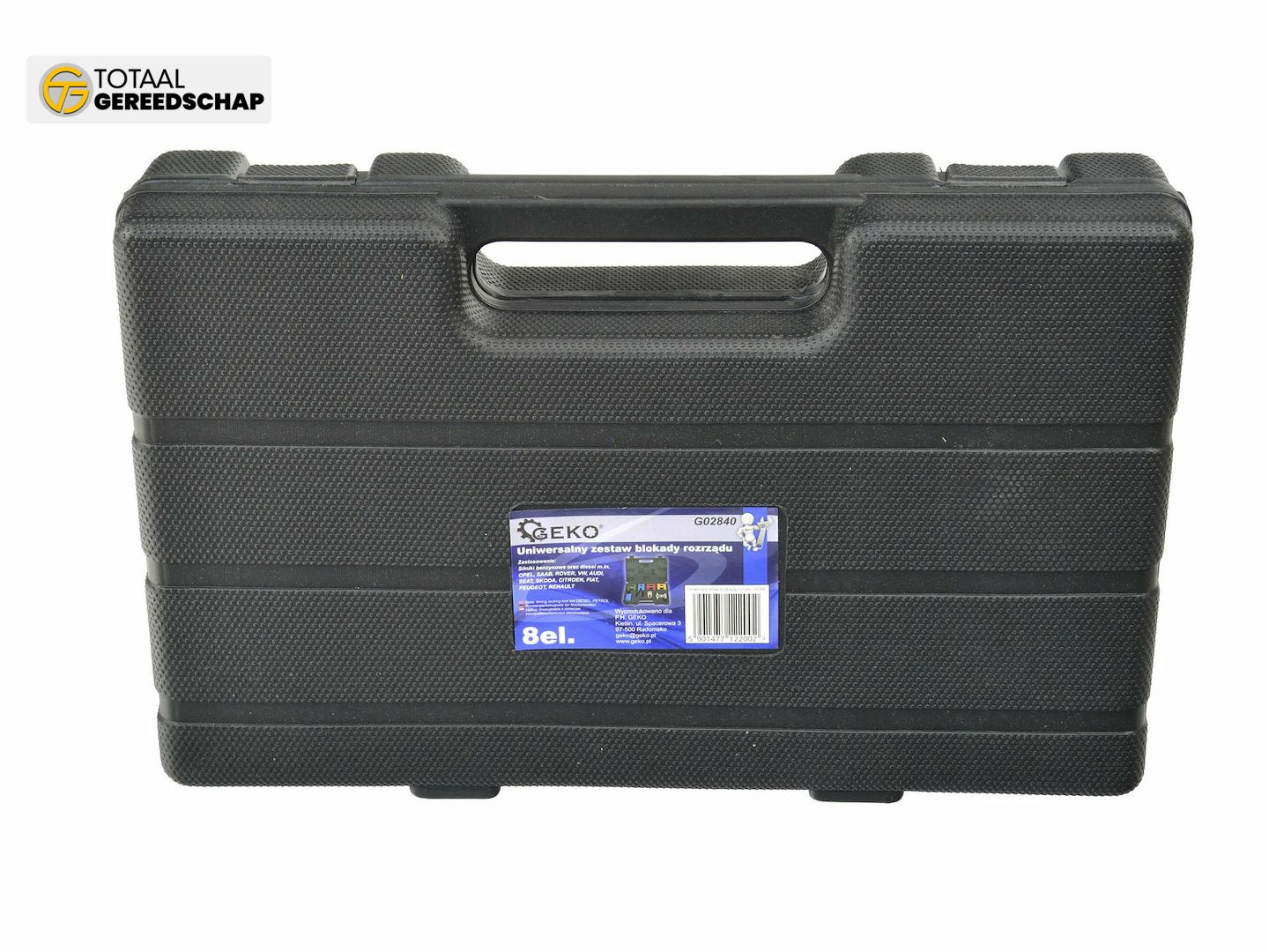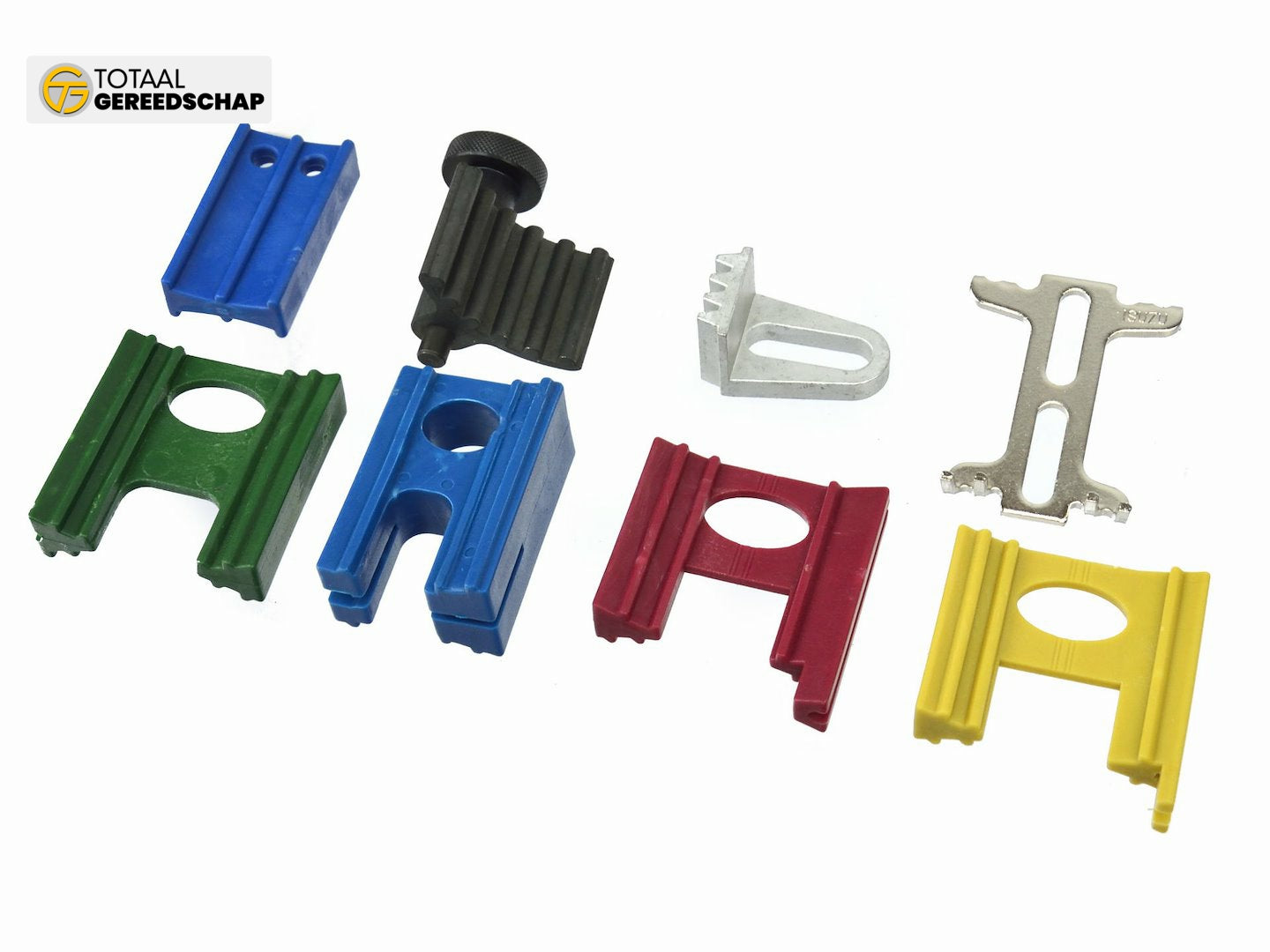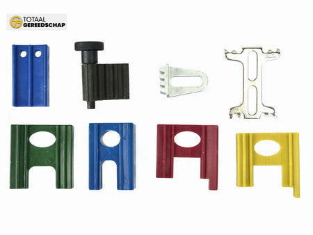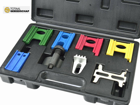 The set includes 8 locking tools and enables locking of timing gear flywheels during servicing or timing belt replacement; the special shape of the locking tools enables setting ignition checkpoints; locking tools lock camshafts and crankshafts.