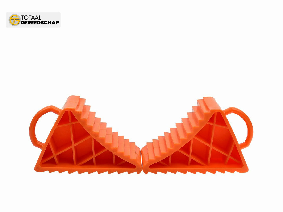 Set of durable wheel chocks. Made of high-quality plastic. Intended to secure various types of vehicles against accidental movement. The anti-slip ribbed surface prevents the chocks from slipping on low-grip surfaces.