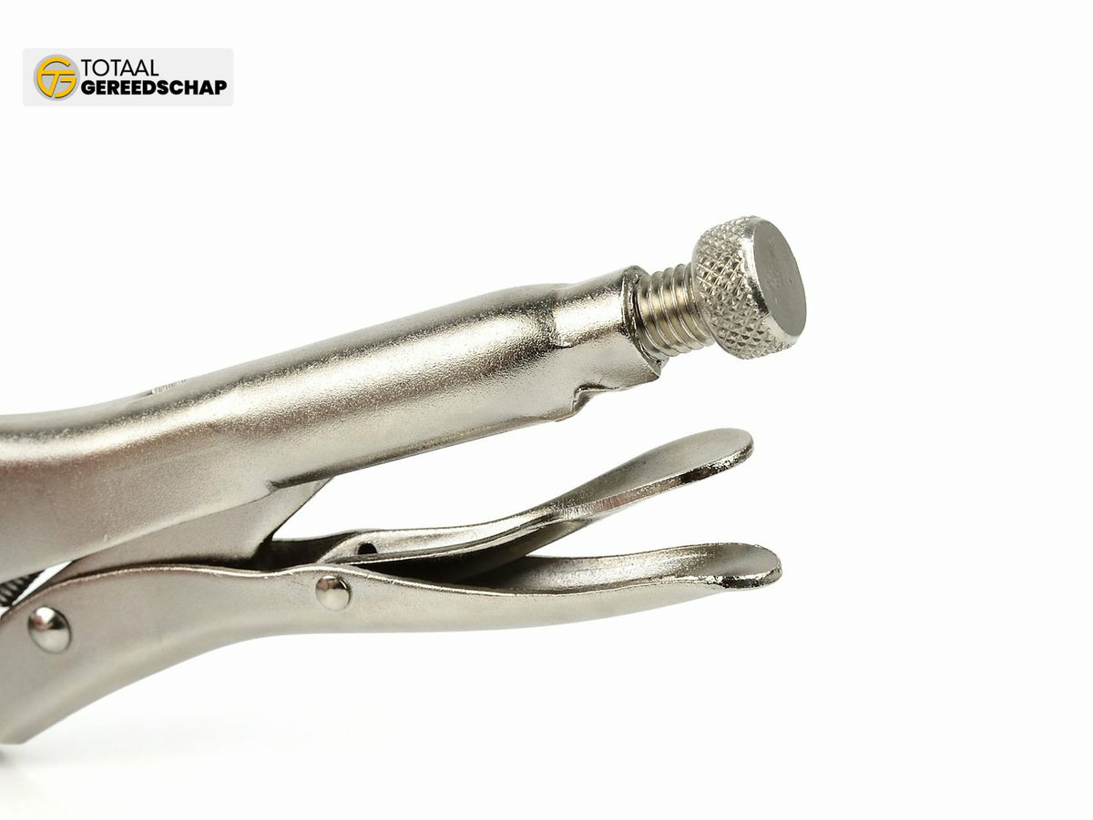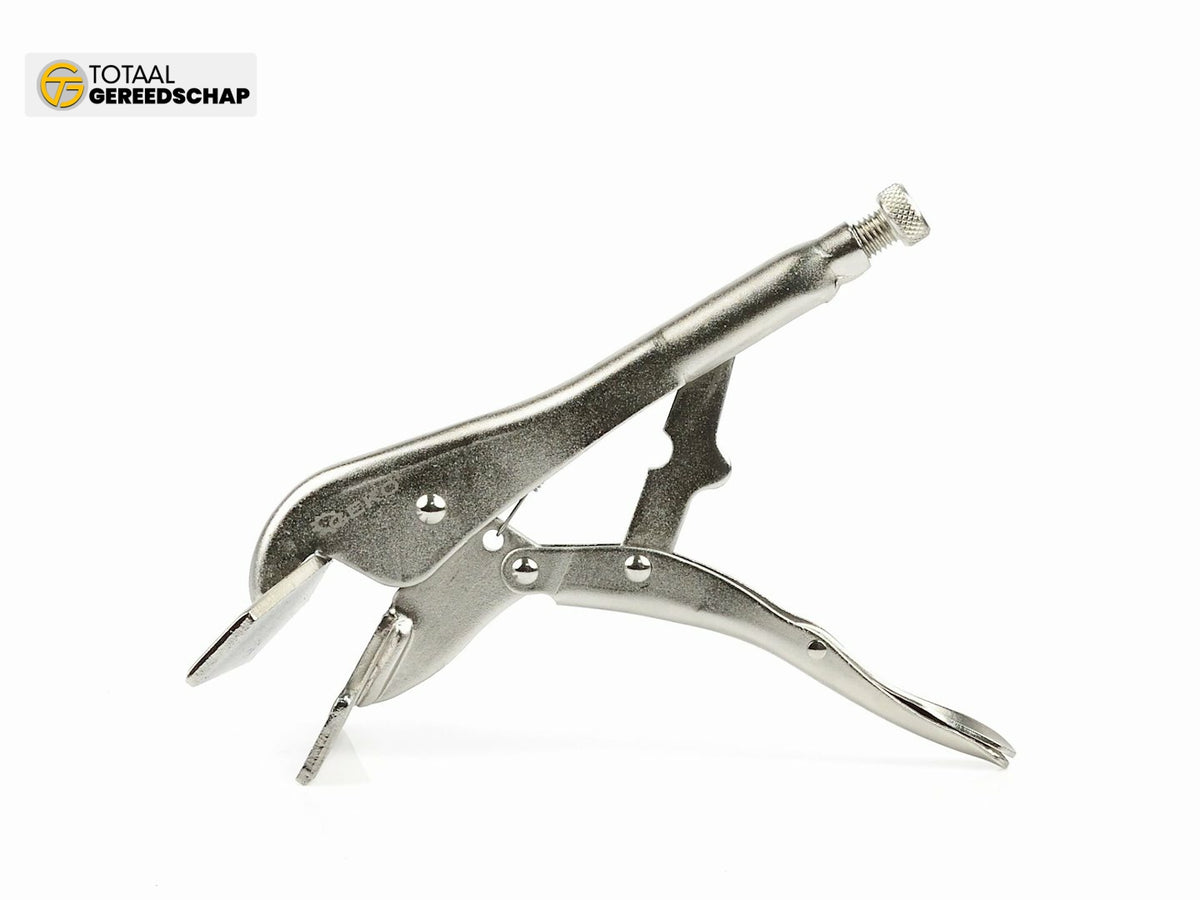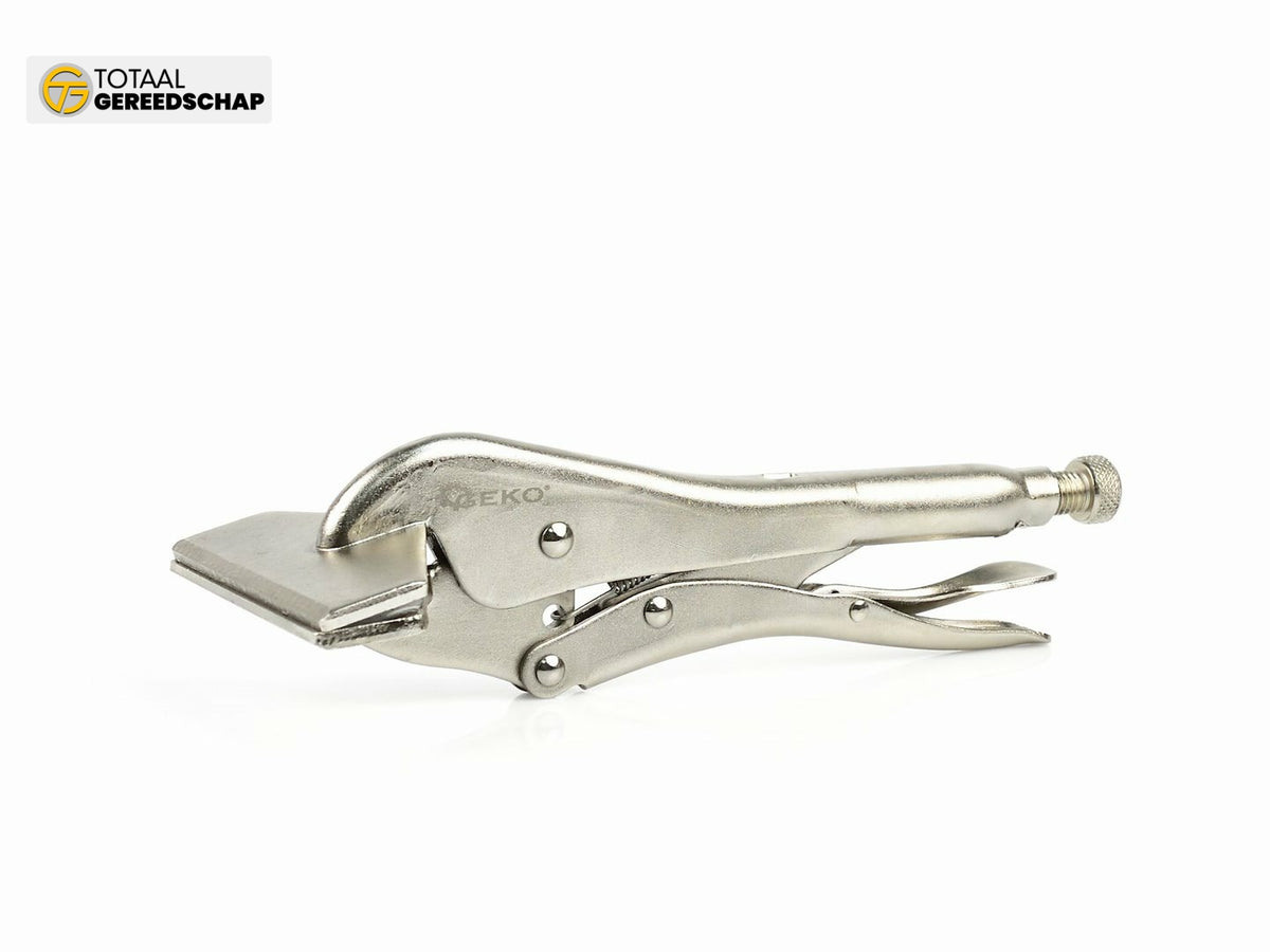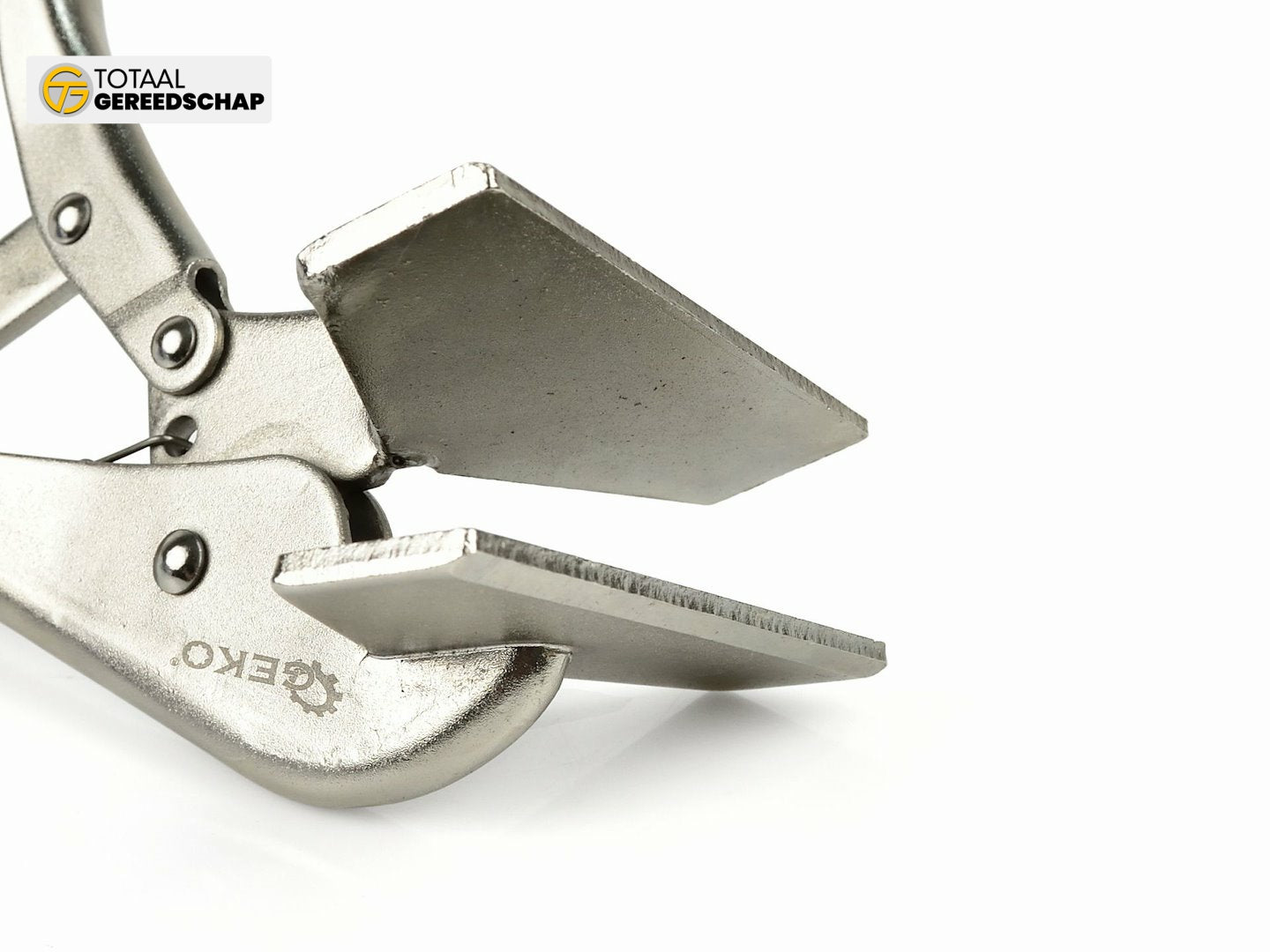 Flat welding locking pliers. Perfect for professional welding shops. The lower, adjustable, The self-locking jaw allows the jaws to be firmly clamped onto the selected element, preventing it from slipping and moving.