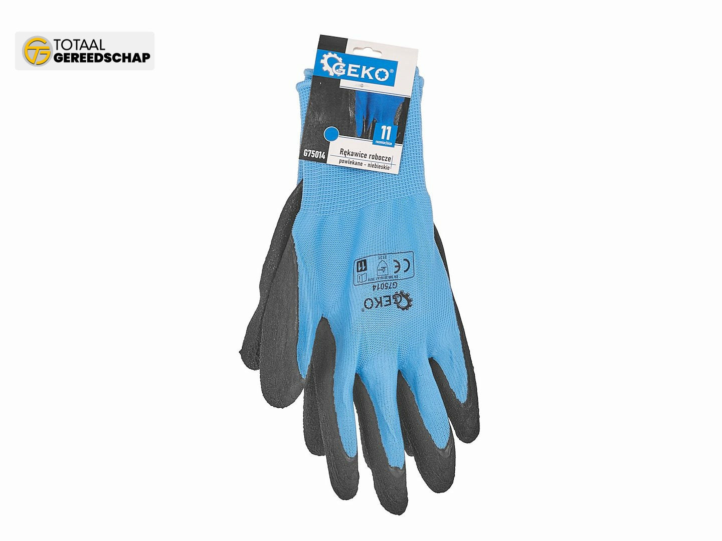 Work gloves made from polyester coated with latex. They are elastic and stretchable, providing a perfect fit for the hand. They are resistant to abrasion and tearing, and available in various colors.