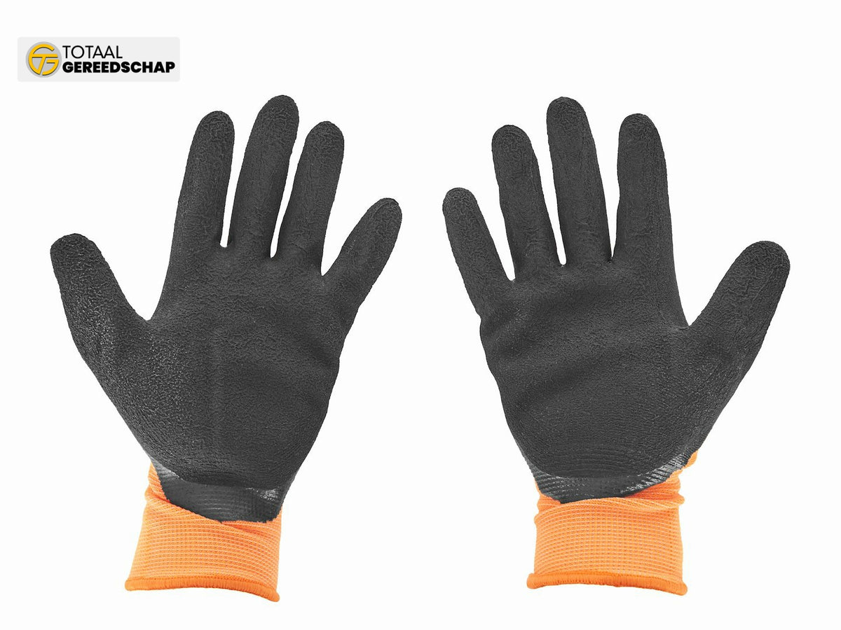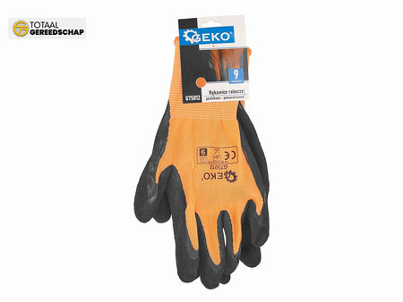 Work gloves made from polyester coated with latex. They are elastic and stretchable, providing a perfect fit for the hand. They are resistant to abrasion and tearing, and available in various colors.