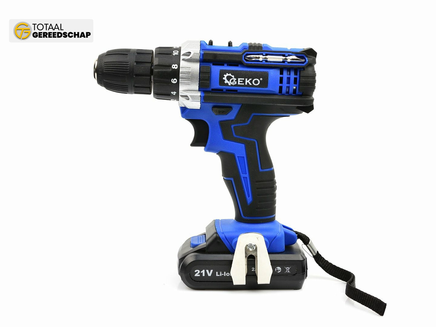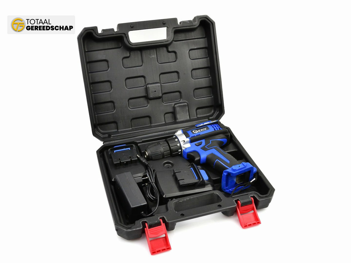 21V Cordless Drill-Driver. The device is ideal for drilling in various materials as well as screwing and unscrewing screws, bolts, sheet metal screws, etc. The set includes two 2Ah batteries, a charger, and a handy plastic carrying case.