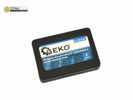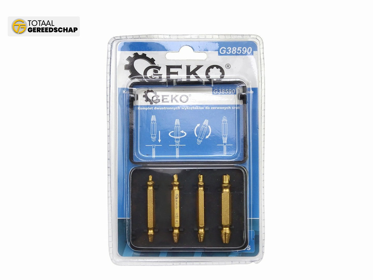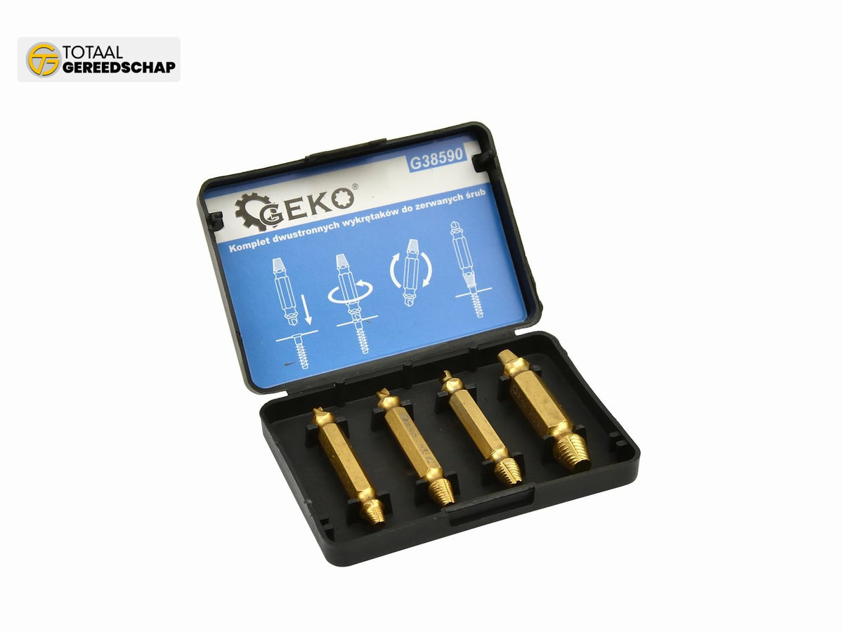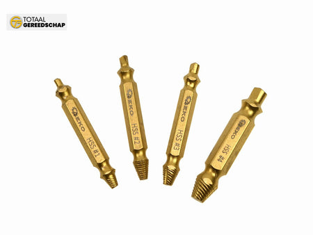 Set of double-ended extractors for broken screws. The extractors are made of HSS TiN high-speed steel. The set is intended for extracting broken or damaged screws and studs. Each extractor is equipped with a drill bit of the appropriate size.