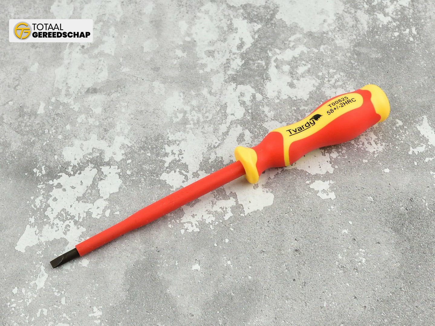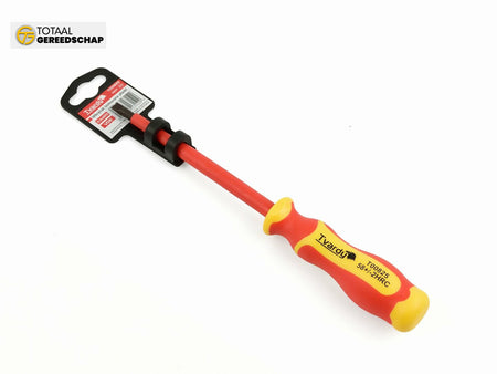 Professional insulated VDE flat screwdriver 5.5x125mm designed for electricians. The ergonomic, multi-component handle provides effective insulation up to 1000V. Perfect for all types of tasks on low-voltage installations. The screwdriver tip is crafted from high-quality S2 steel heat-treated to achieve optimal parameters, with tip hardness in the 56-60 HRC range. The screwdriver shaft is made from CRV steel, noted for its enhanced elasticity.