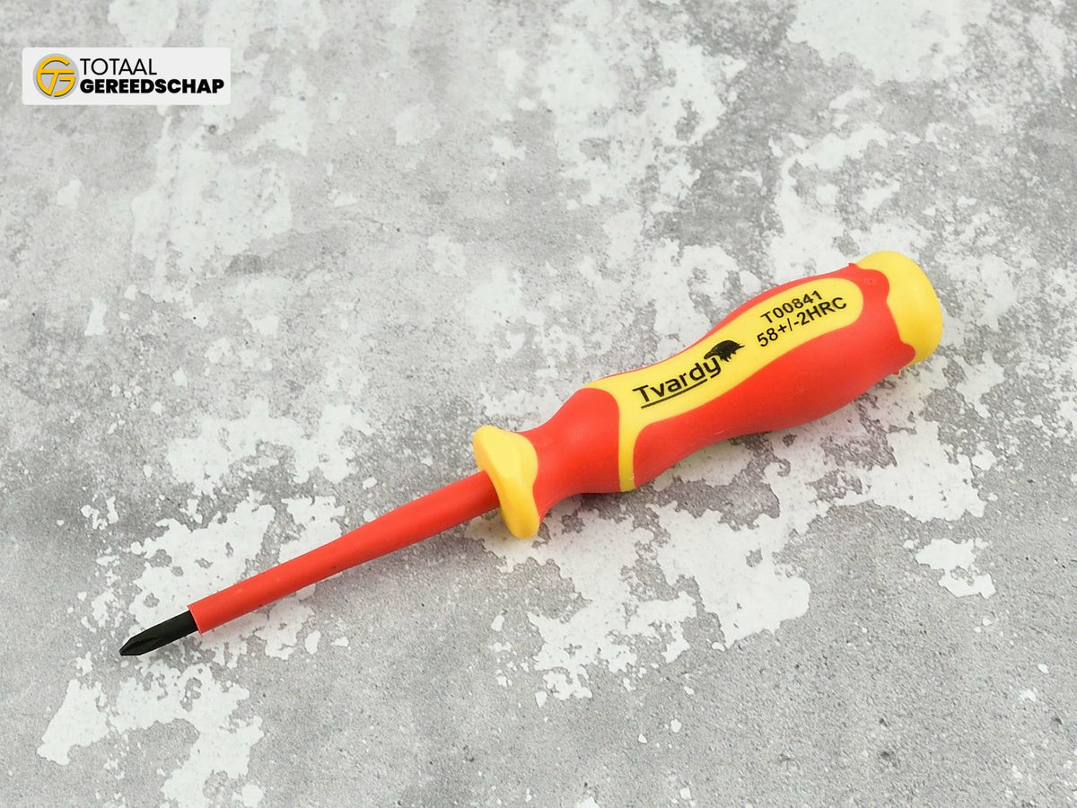 Professional insulated VDE Phillips screwdriver PH1 designed for electricians. The ergonomic, multi-component handle provides effective insulation up to 1000V. It performs well for all types of work on low-voltage installations. The screwdriver tip is made of high-quality S2 steel heat-treated to achieve optimal parameters, with tip hardness in the 56-60 HRC range. The screwdriver shaft is made of CRV steel, noted for greater elasticity.
