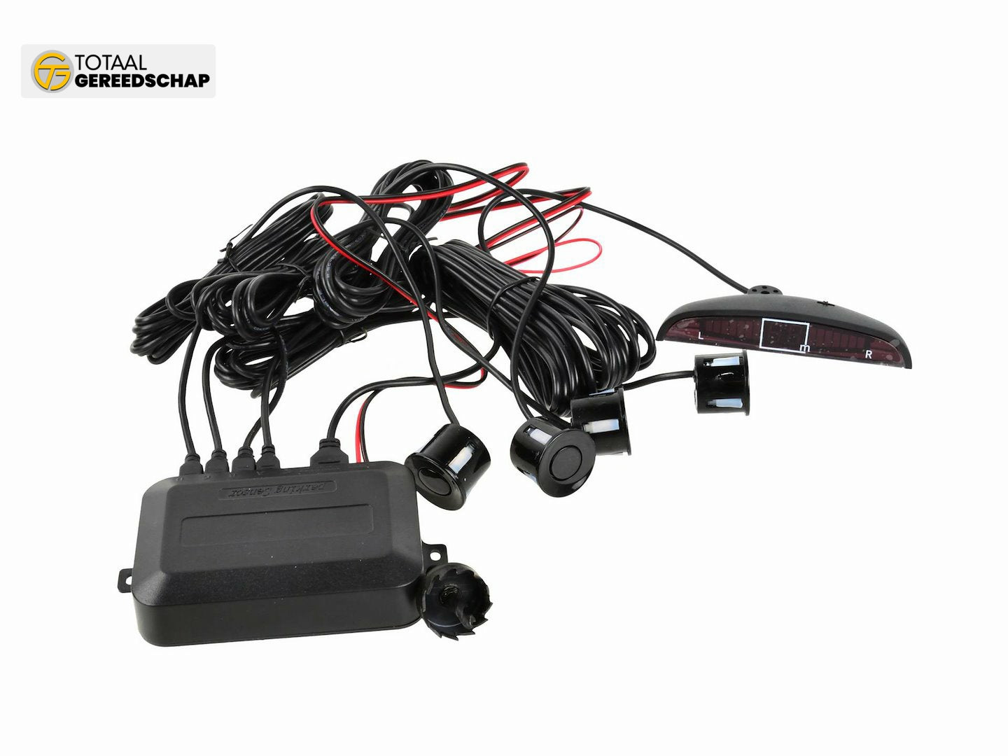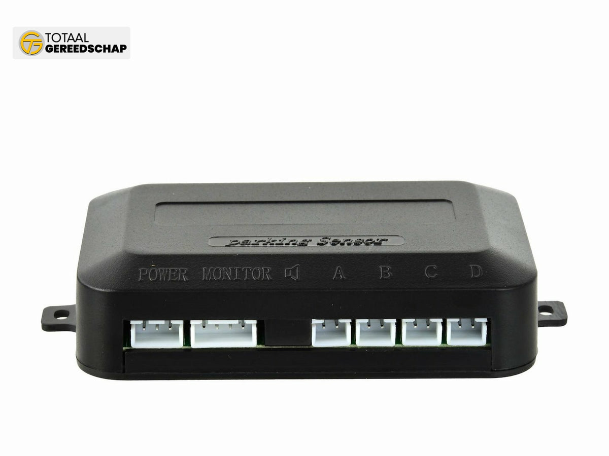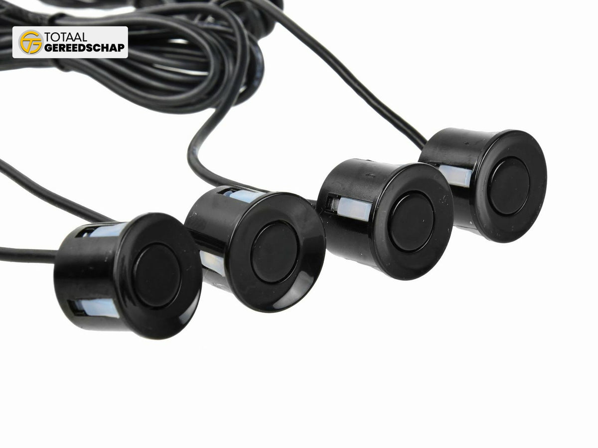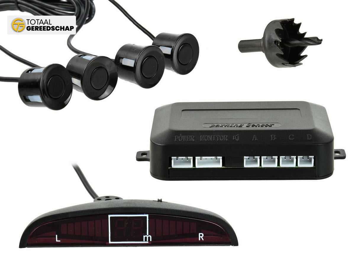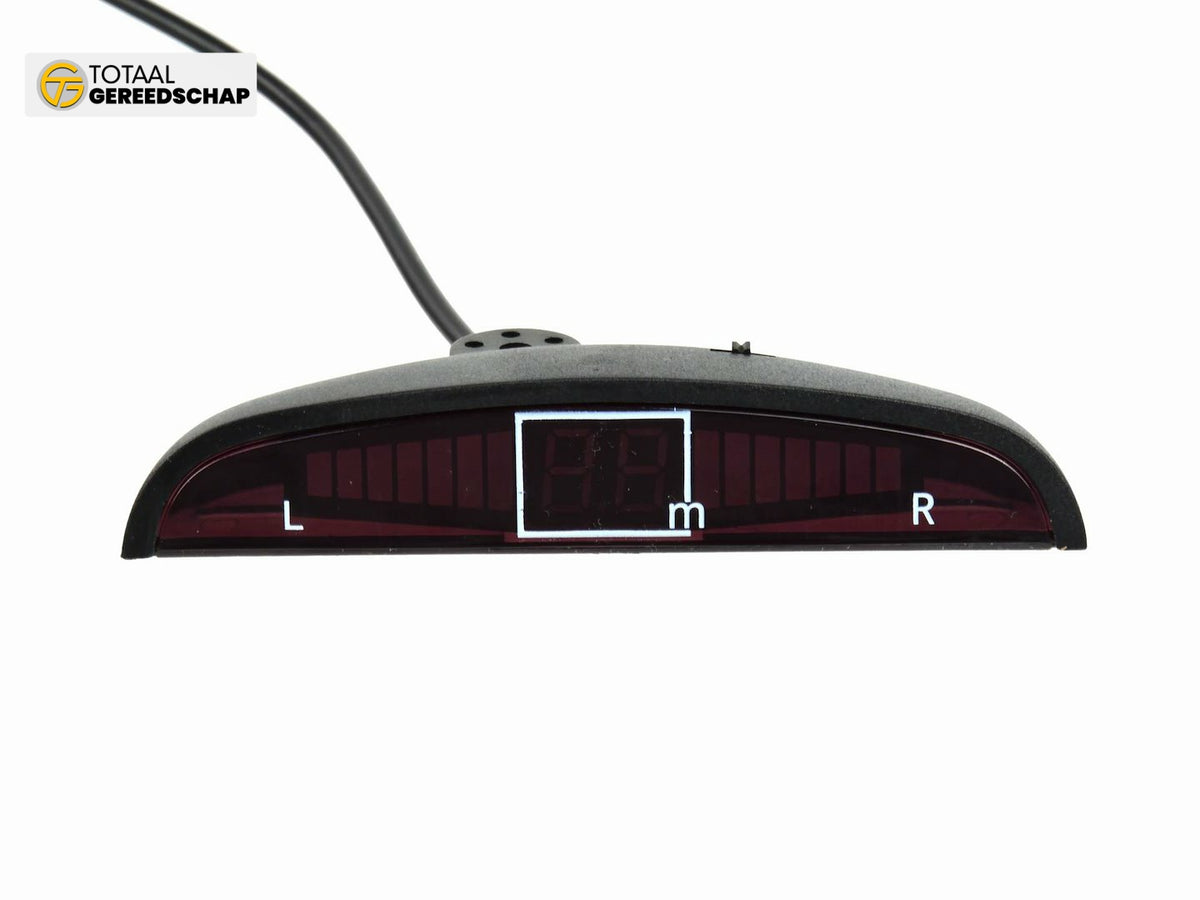Universal ultrasonic 4-point parking/reversing sensor equipped with an LCD display with BUZZER. The LCD display indicates the distance and position of the obstacle both numerically and graphically.