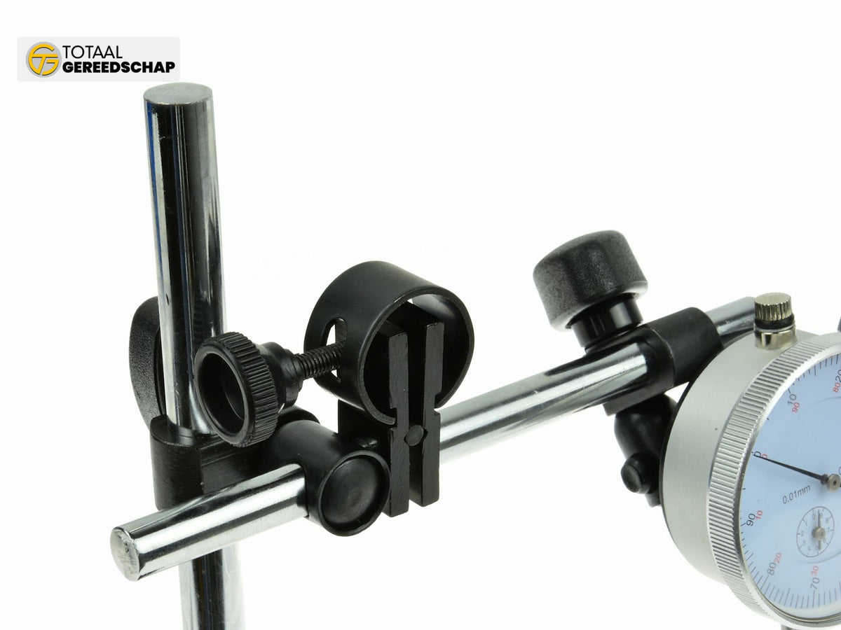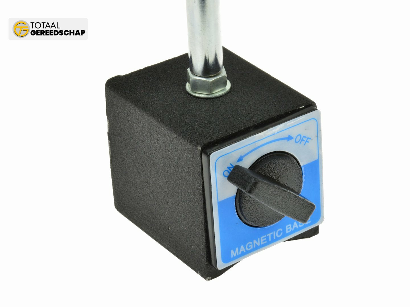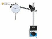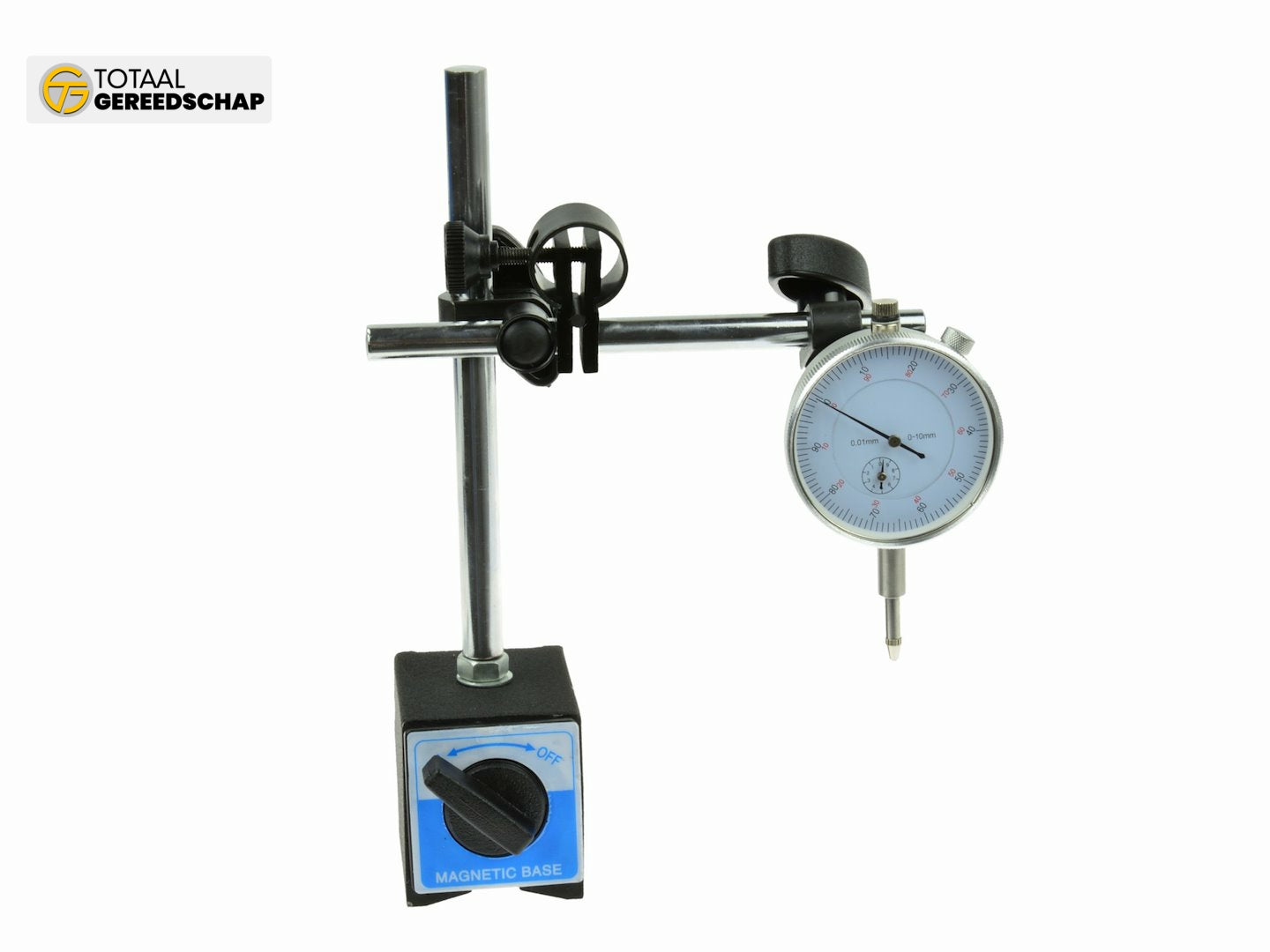 Precision dial gauge 0-10 mm with an accuracy of up to 0.01 mm, included with a magnetic base. The set is designed for very precise verification of the geometric shapes of various components and checking the correctness of their mutual positioning in an assembly of other subcomponents. The magnetic stand has an ON/OFF switch to activate the magnet on the base.