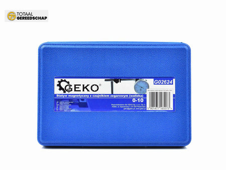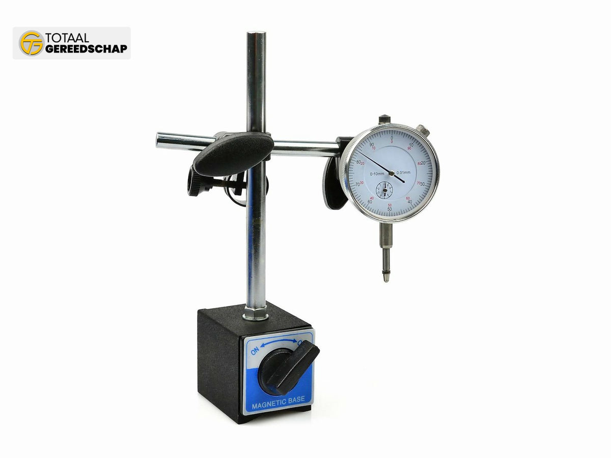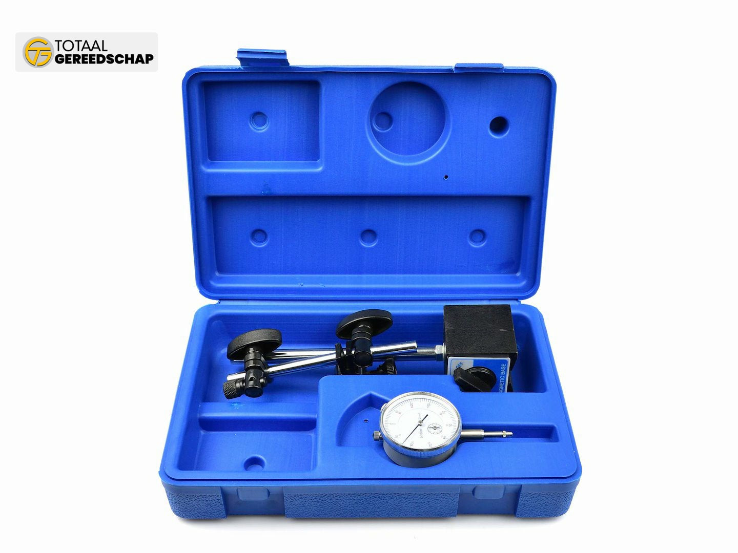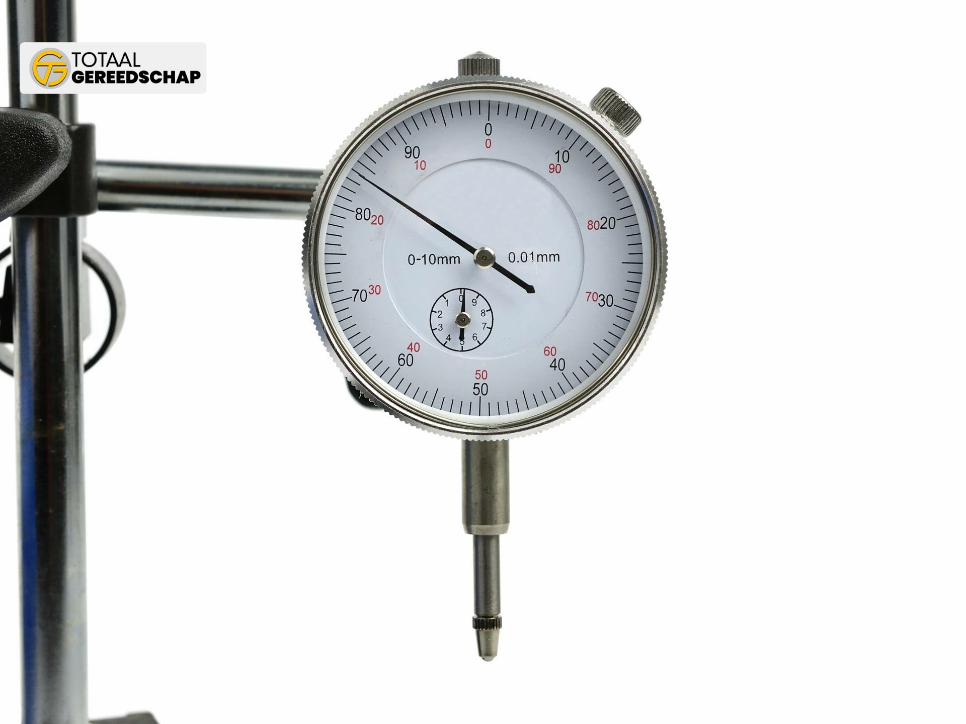 Precise dial gauge sensor 0-10 mm with an accuracy of 0.01 mm included with a magnetic base. The set is intended for very precise checking of geometric shapes of various elements and controlling the correctness of their mutual positioning within a group of other components.