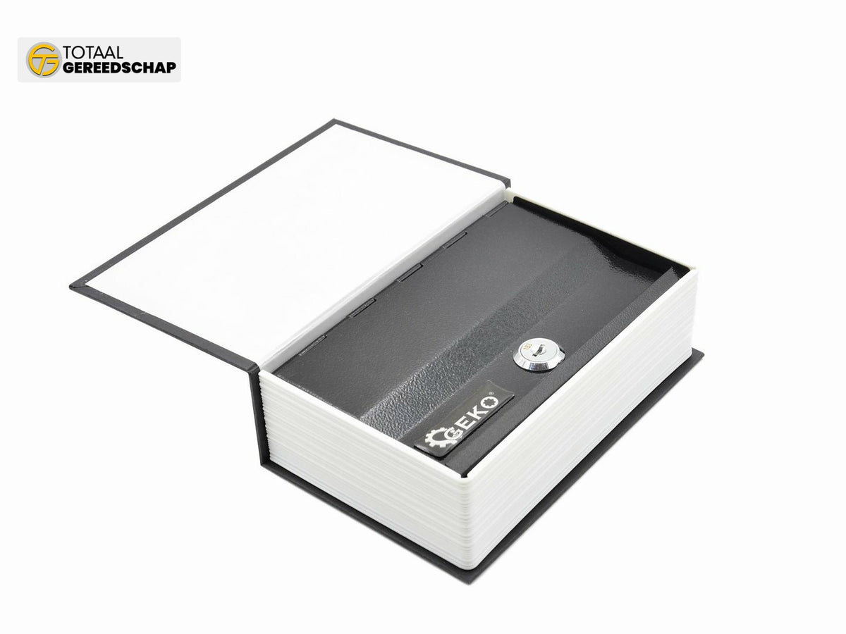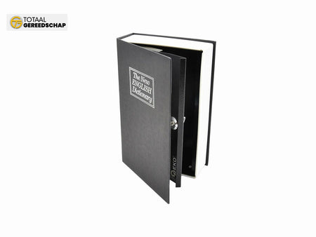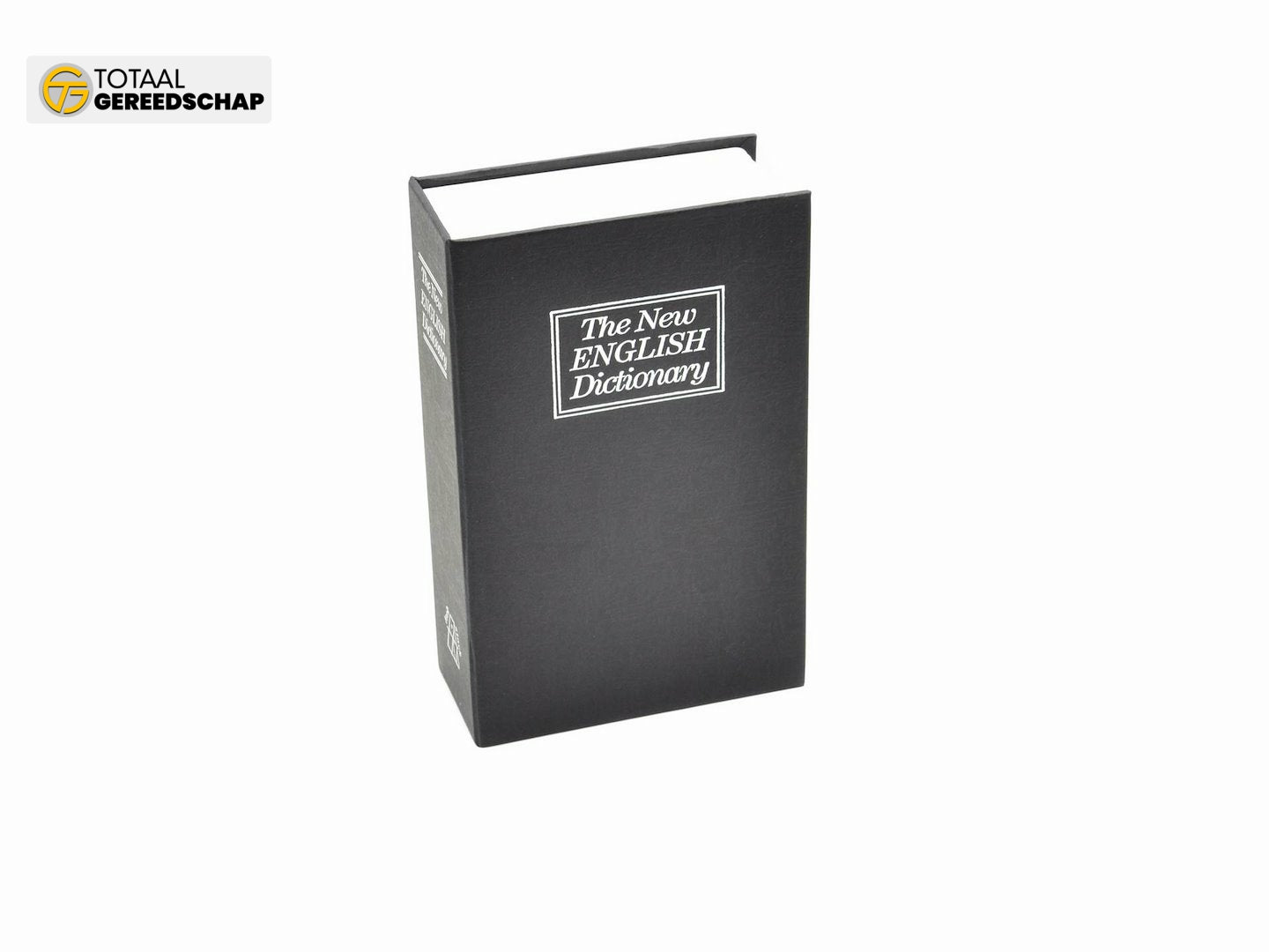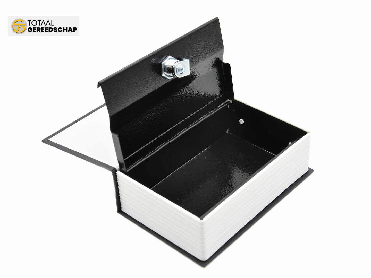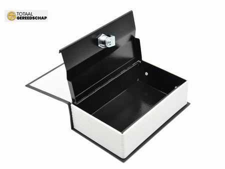 Box in the form of a book. Inside, a metal compartment. Comes with two keys. External dimensions: 180 x 115 x 55 mm. Compartment dimensions: 165 x 115 x 49 mm.