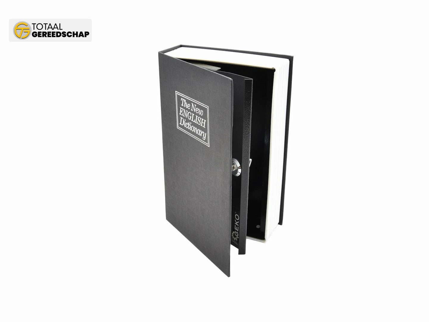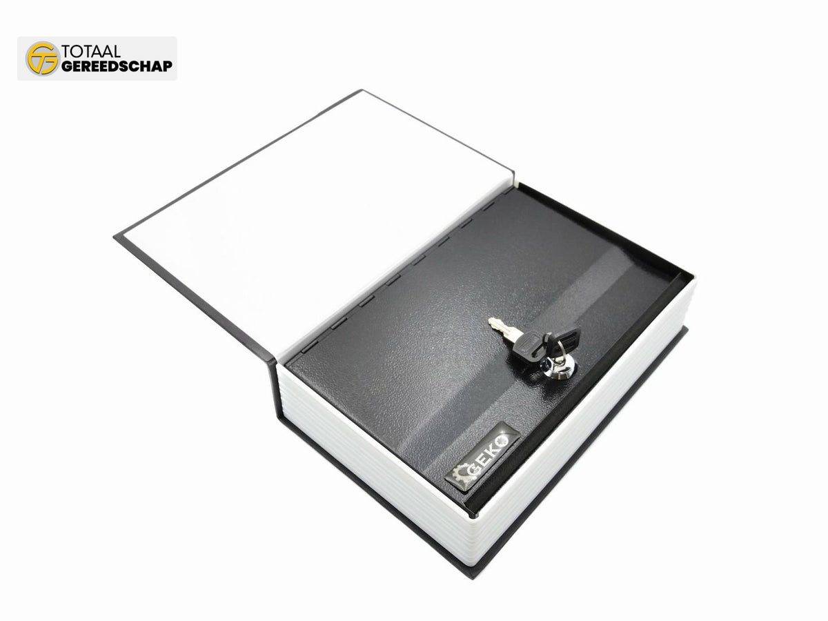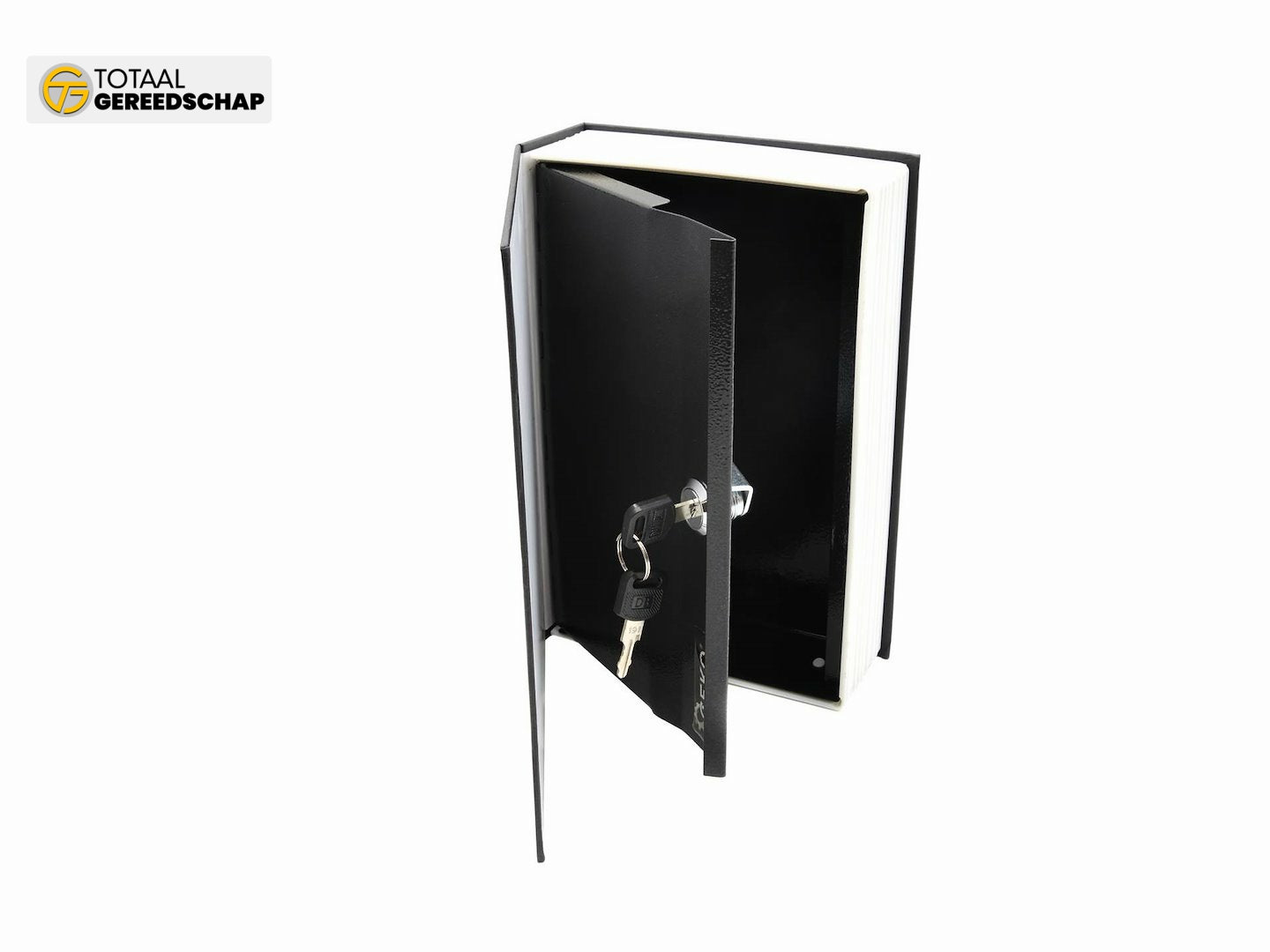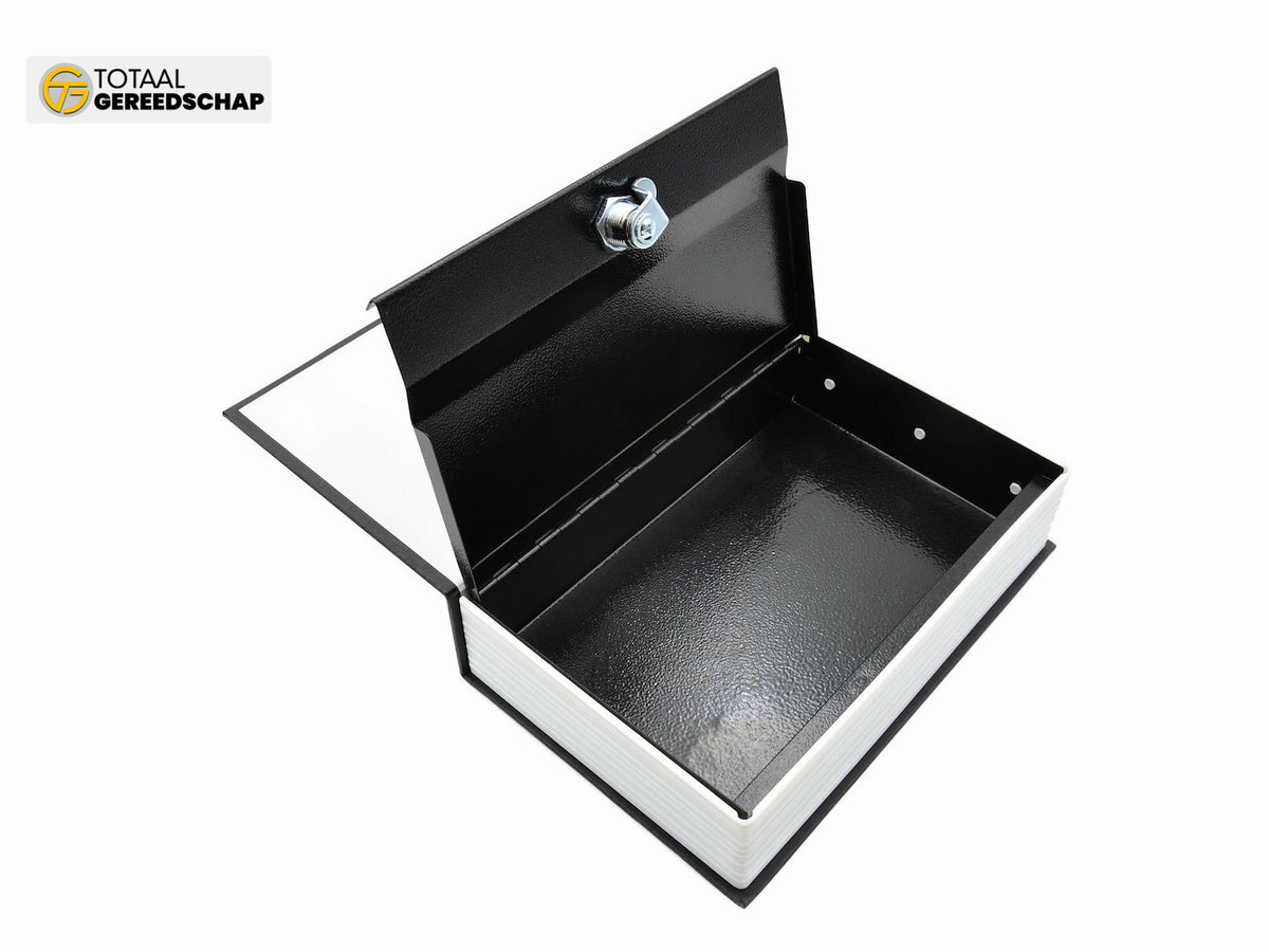 Box in the form of a book. Inside, a metal compartment. Comes with two keys.