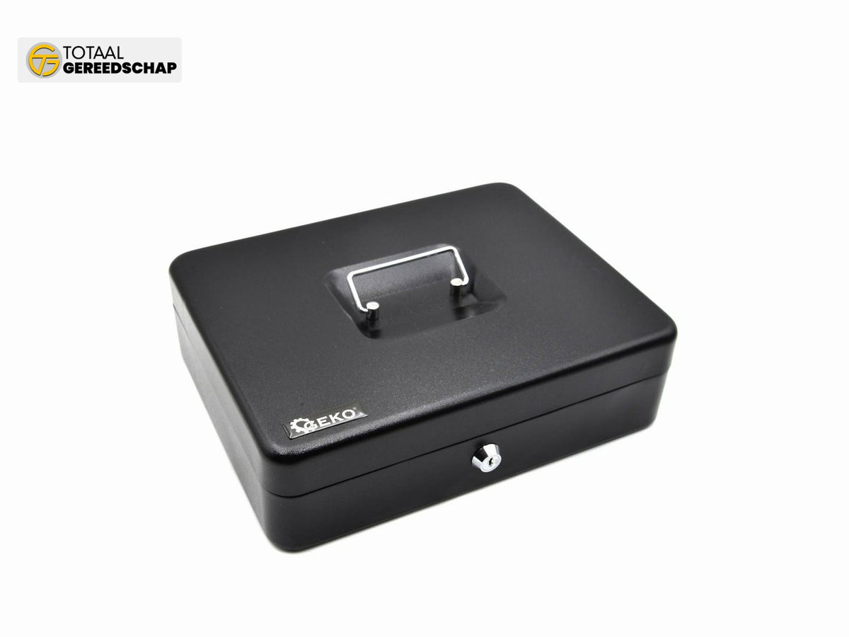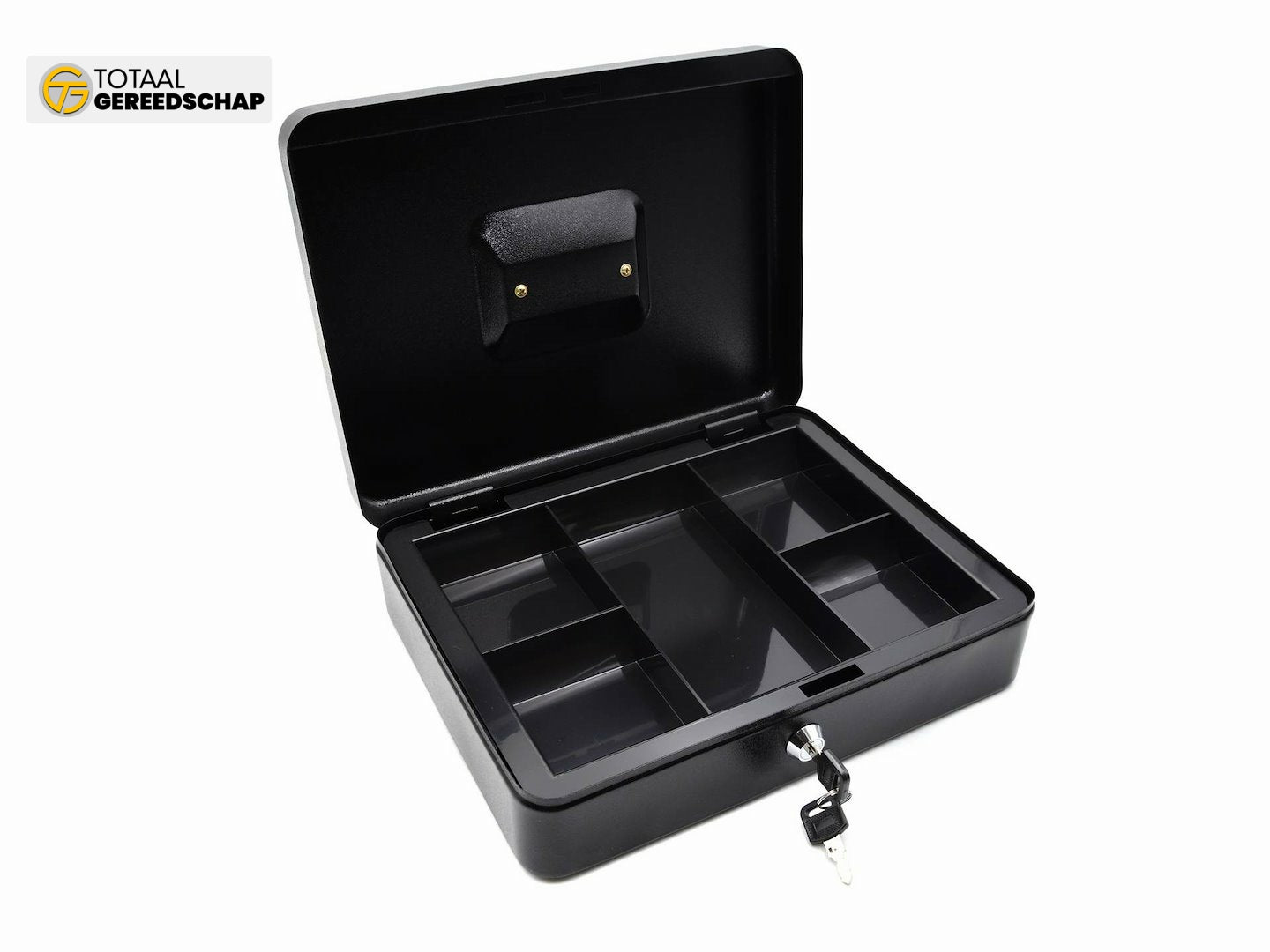 Metal money box. Lockable with a key (2 pieces included). Equipped with a carrying handle. Inside, a plastic insert with compartments: