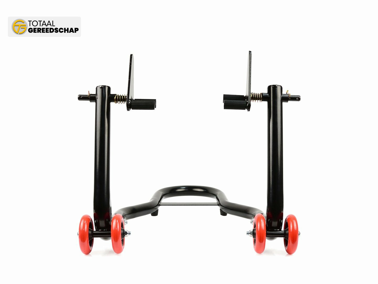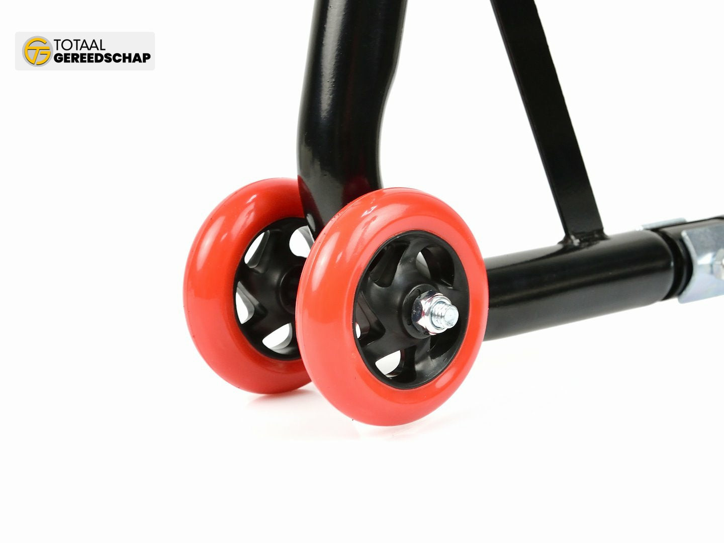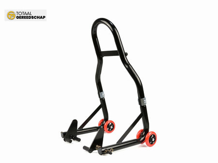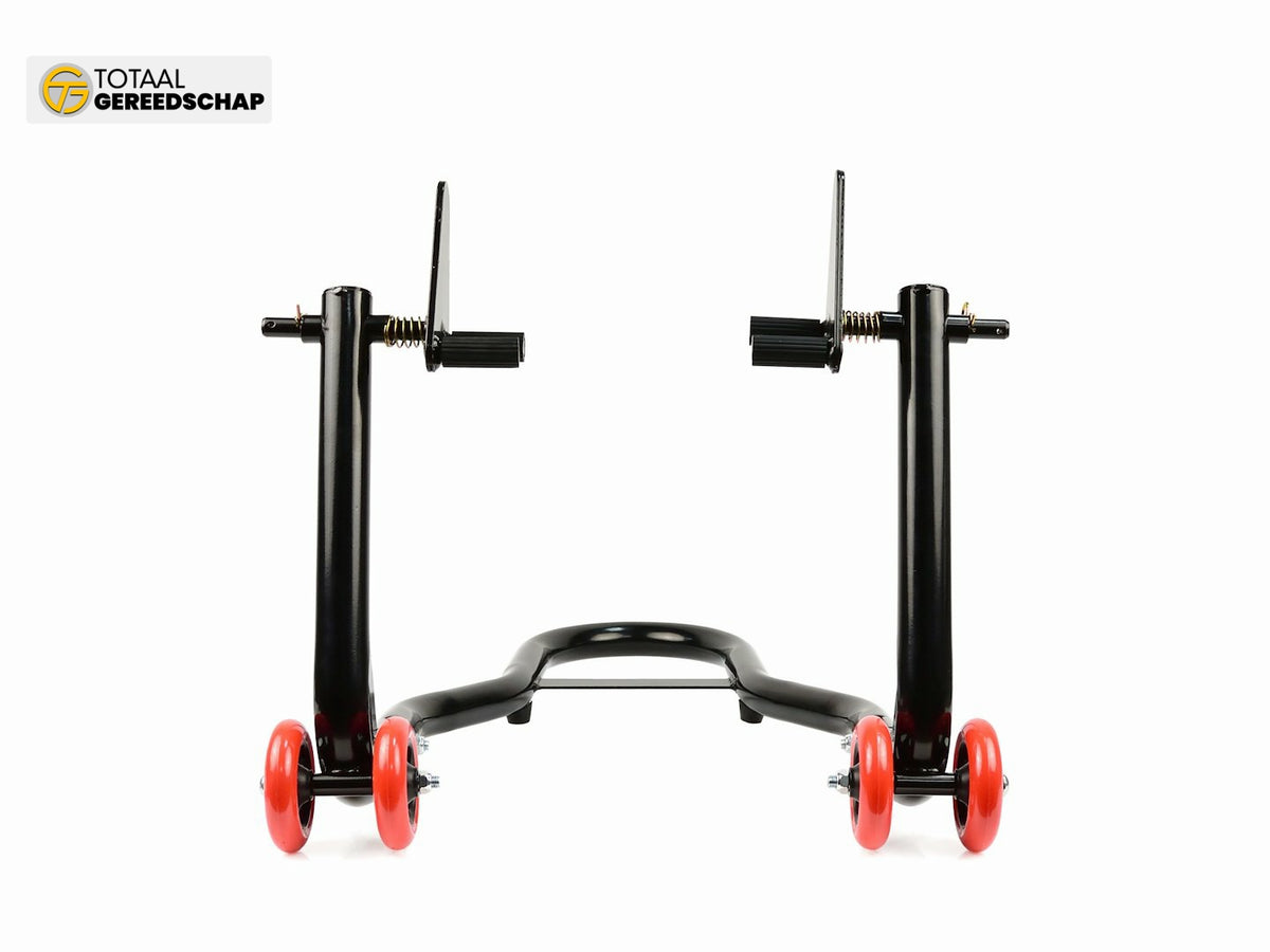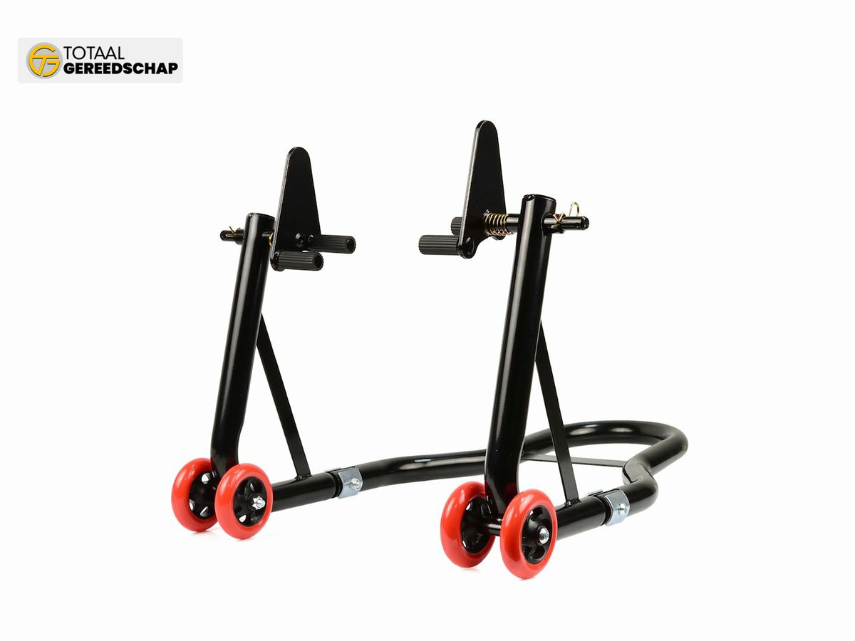 Reinforced motorcycle stand for the front axle. Made using a 32 mm diameter steel tube powder-coated. Additionally, the reinforced structure of the stand guarantees stable and safe lifting of the motorcycle. Wheels are made of high-quality ABS plastic.