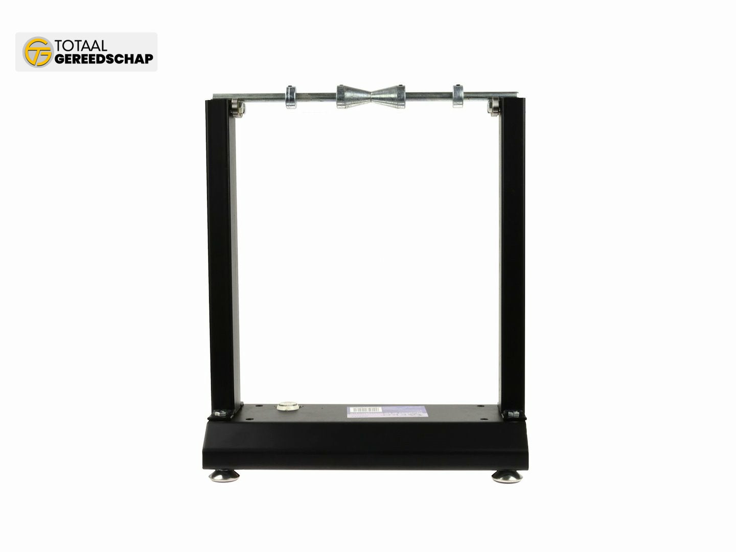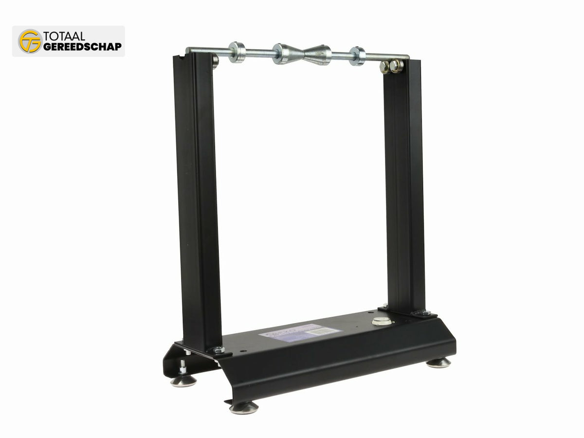 Motorcycle wheel balancer for wheel measuring up to 10" wide by 28" diameter. Fitted with two cones and spindle for precise, easy alignment and balancing. The axle rests on dual smooth rolling bearings on each side allowing the wheel to be well balanced between two support arms. Balances tires for Harleys, cruiser bikes, MX dirt bikes, road bikes, sport bikes and other motorcycles.
