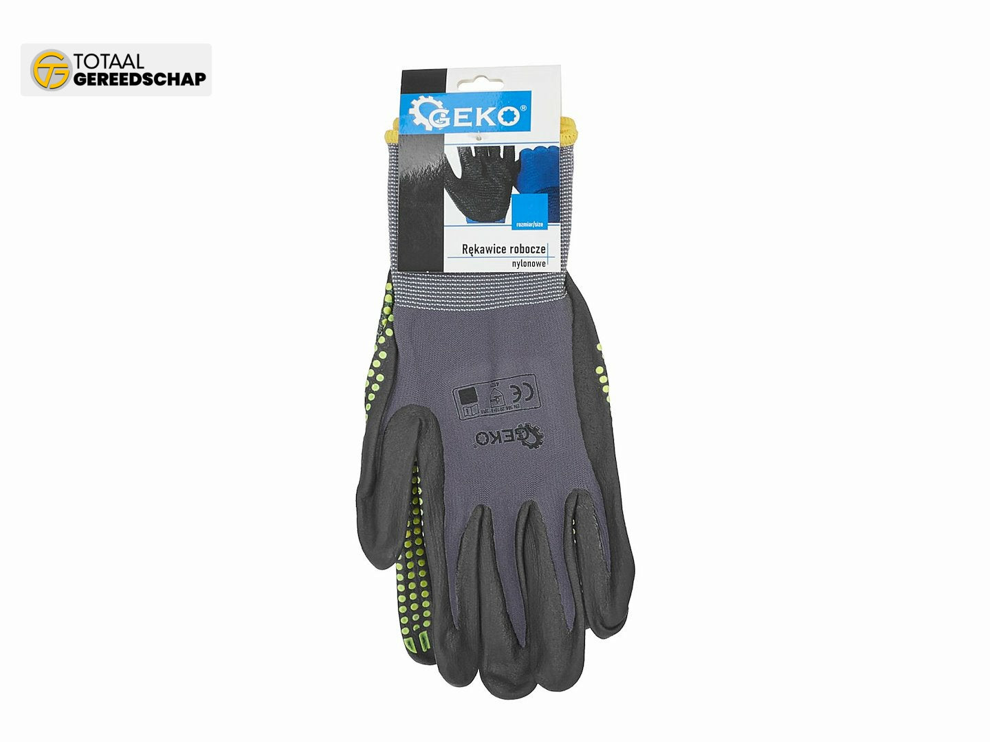 Work gloves made of nylon with dotted latex for a strong and secure grip. These gloves are stretchable, durable, and highly resistant to abrasion and tearing.