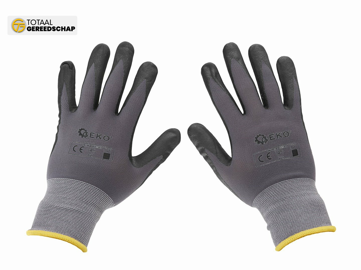 Work gloves made from nylon with dotted latex providing a strong and secure grip. These gloves are stretchable, durable, and highly resistant to abrasion and tearing.