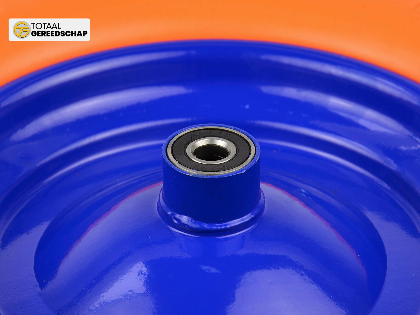 Tubeless wheel for trolleys, size 4.00-8. Made from durable polyurethane material. The reinforced powder-coated metal rim ensures enhanced stability. Constructed from high-quality materials.