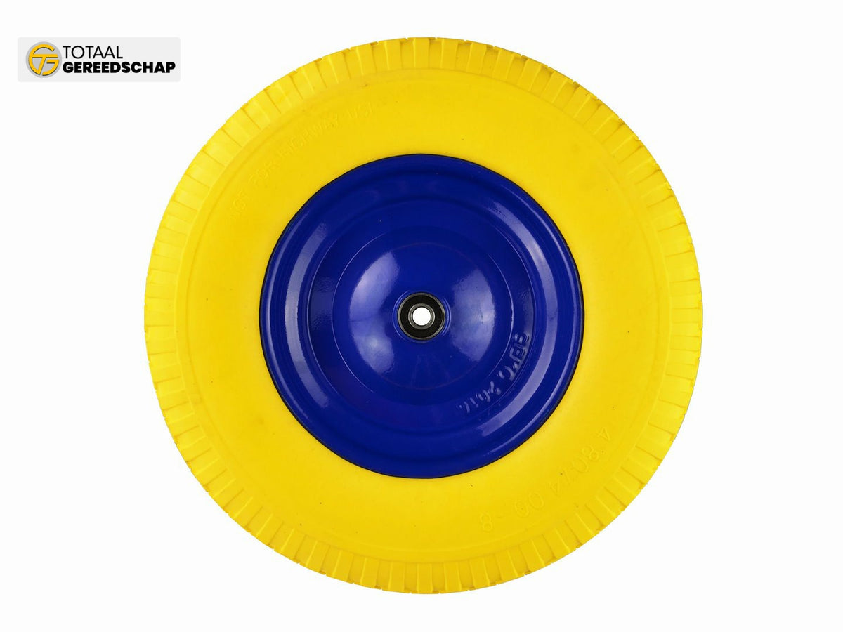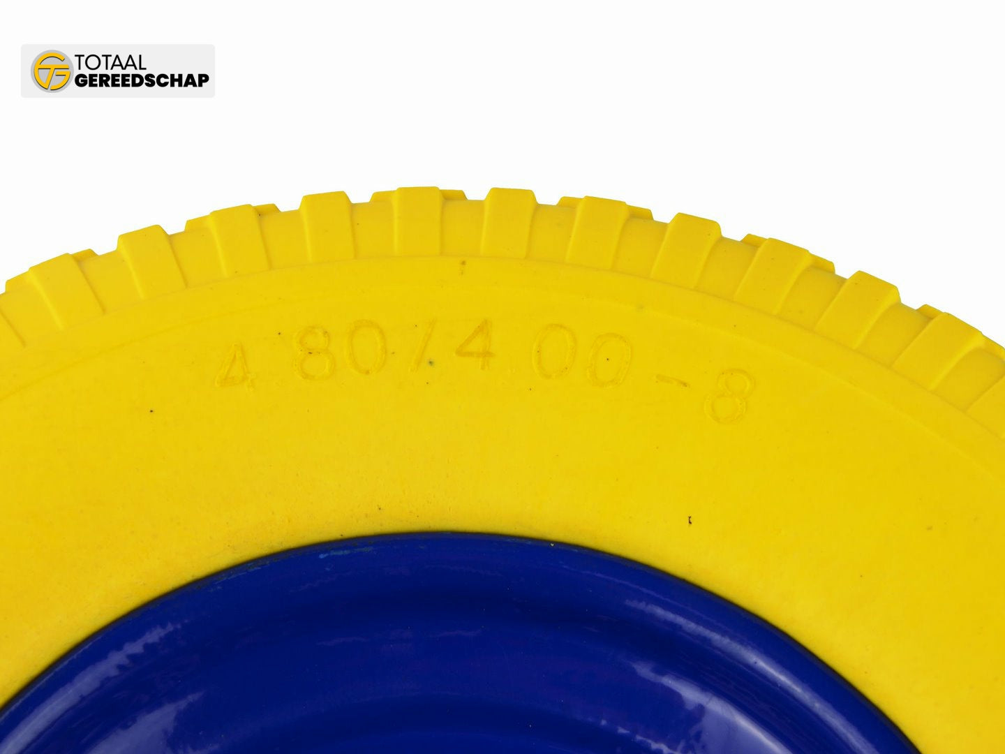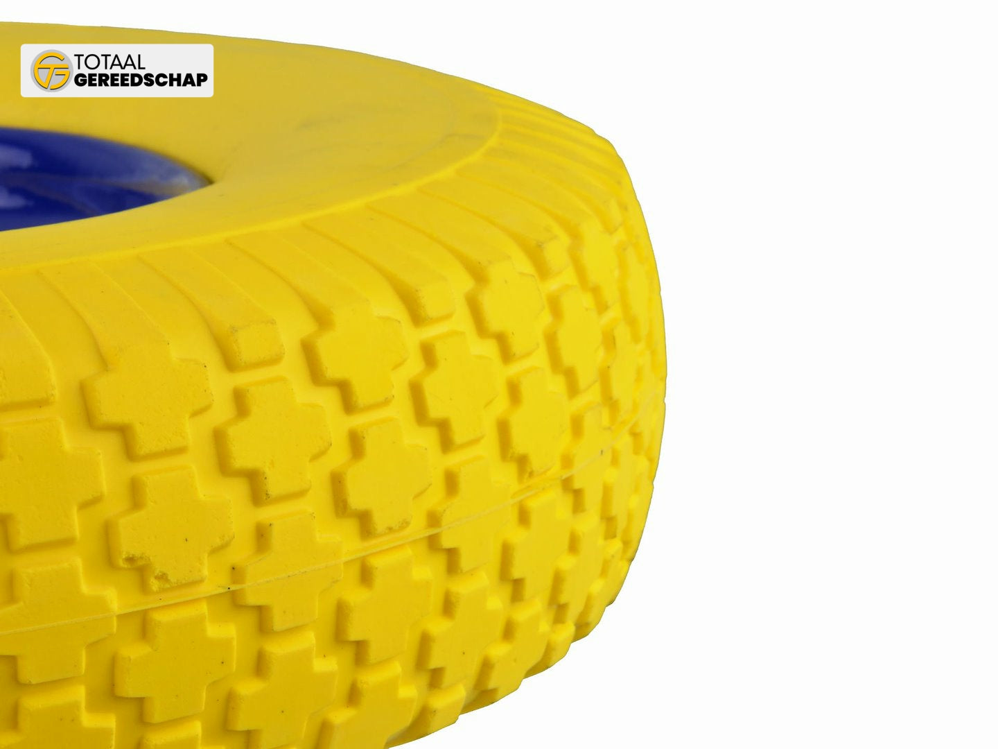 Tubeless wheel for trolley 4.00-8. Made from durable polyurethane material. The reinforced powder-coated metal rim ensures increased stability. Constructed from high-quality materials.