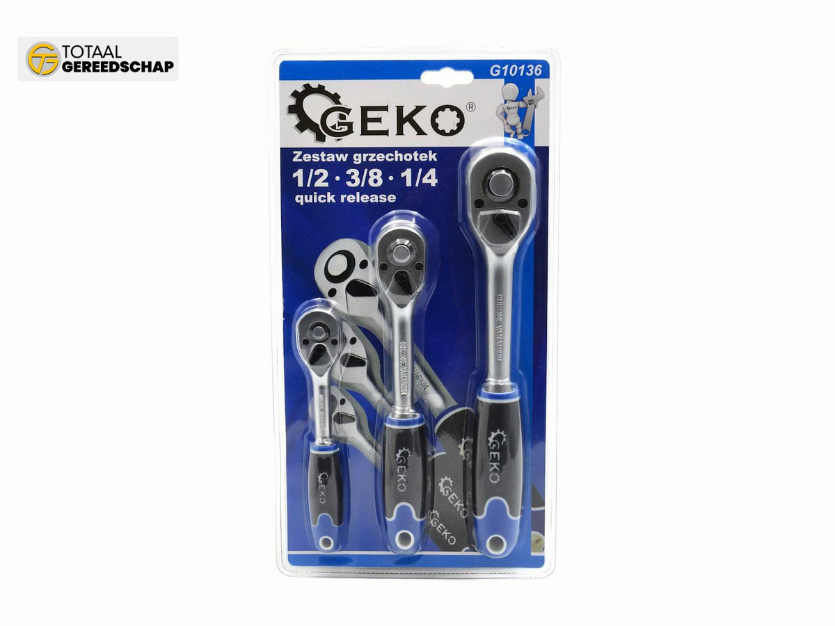 Set of simple ratchets from the renowned tool brand GEKO, based on a strong and precise 45-tooth mechanism. Designed to work with sockets with 1/2", 3/8", 1/4" drives. The ratchets are made of the highest quality chrome-vanadium steel (CrV).