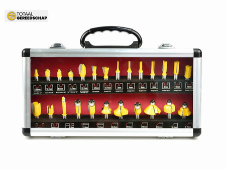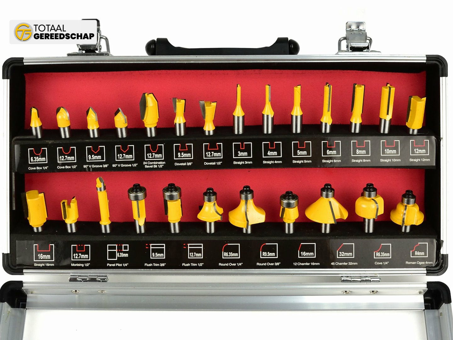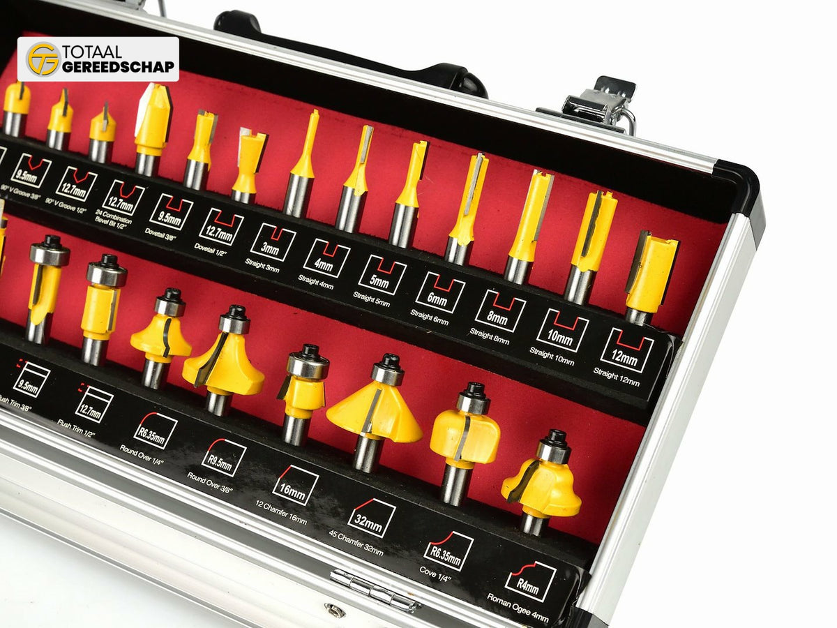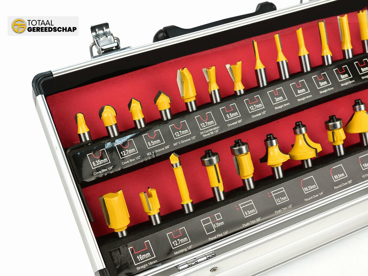 A set of 25 profiling router bits for wood allowing for precise material processing. High-speed steel (HSS) blades enable their use for machining solid wood, chipboard, MDF, and other wood-based materials. The bearings used reduce rolling resistance, so the bits are perfect for shaping rounded materials. The entire set is placed in a practical wooden case, where each bit has its labeled spot.