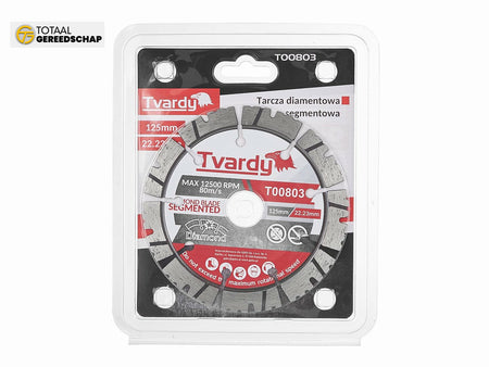 Professional diamond blade by Tvardy. The SEGMENTED profile blade is designed for cutting construction materials such as: concrete, reinforced concrete, brick, masonry stone, sidewalk, roof tile, marble, granite, sandstone, asphalt. The diamond blade is 125mm in diameter and 1.4mm thick. It has a diamond grit height of 13mm and thickness of 2.4mm.