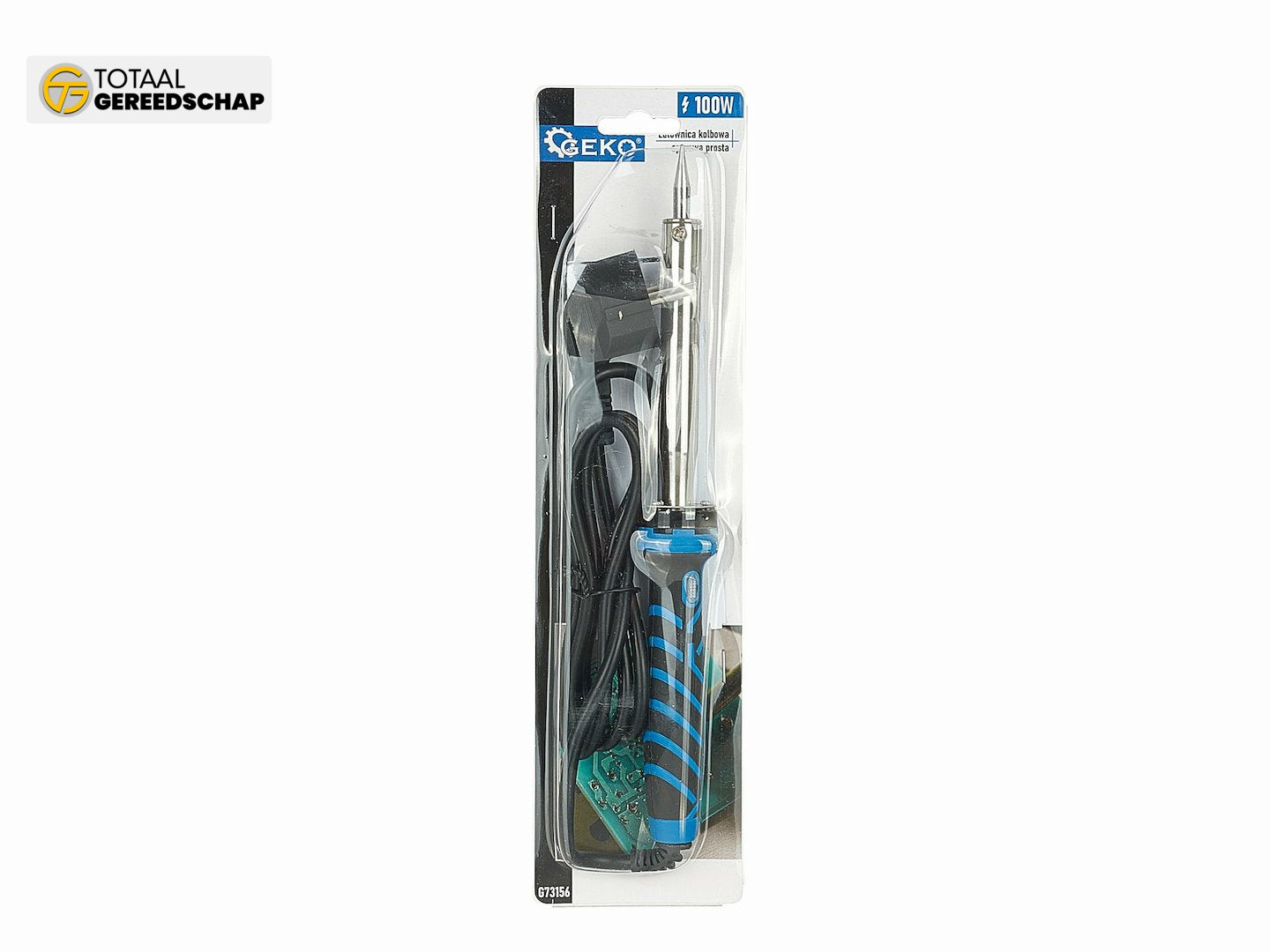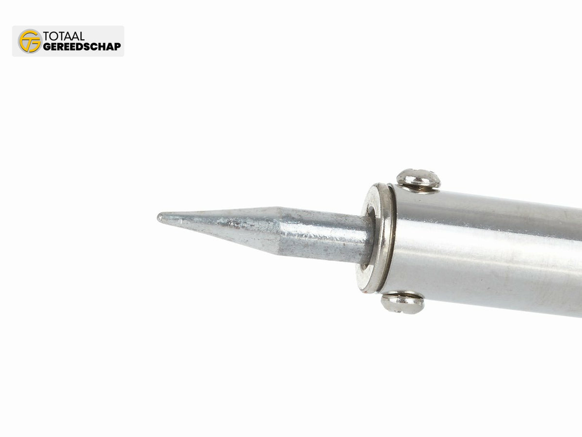 A straight resistance soldering iron with a power of 100W. Equipped with a base that allows you to place the soldering iron in a safe location when it's not in use.