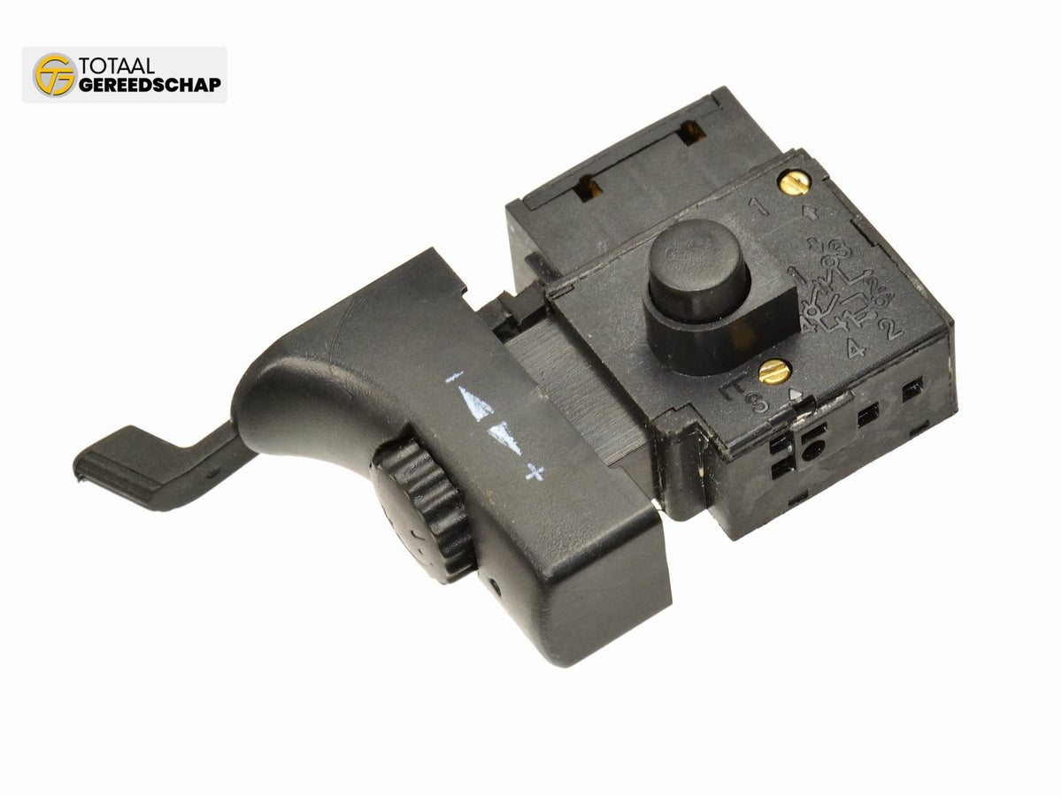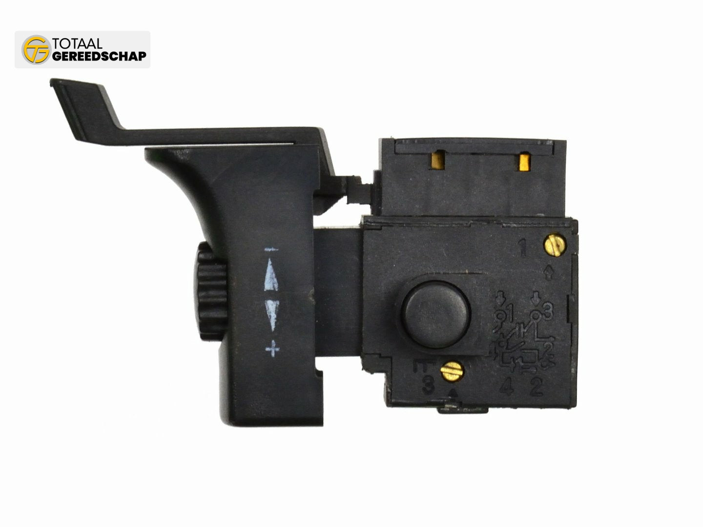 Push switch with speed control, rotation direction change right/left, and permanent lock-on in the ON position.