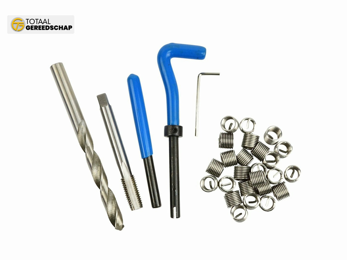 Damaged thread repair set M10x1.5mm. The set includes a tap and drill made of high-quality HSS4341 high-speed steel, a guide knob, a punch and a set of spiral inserts.