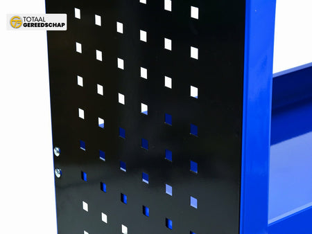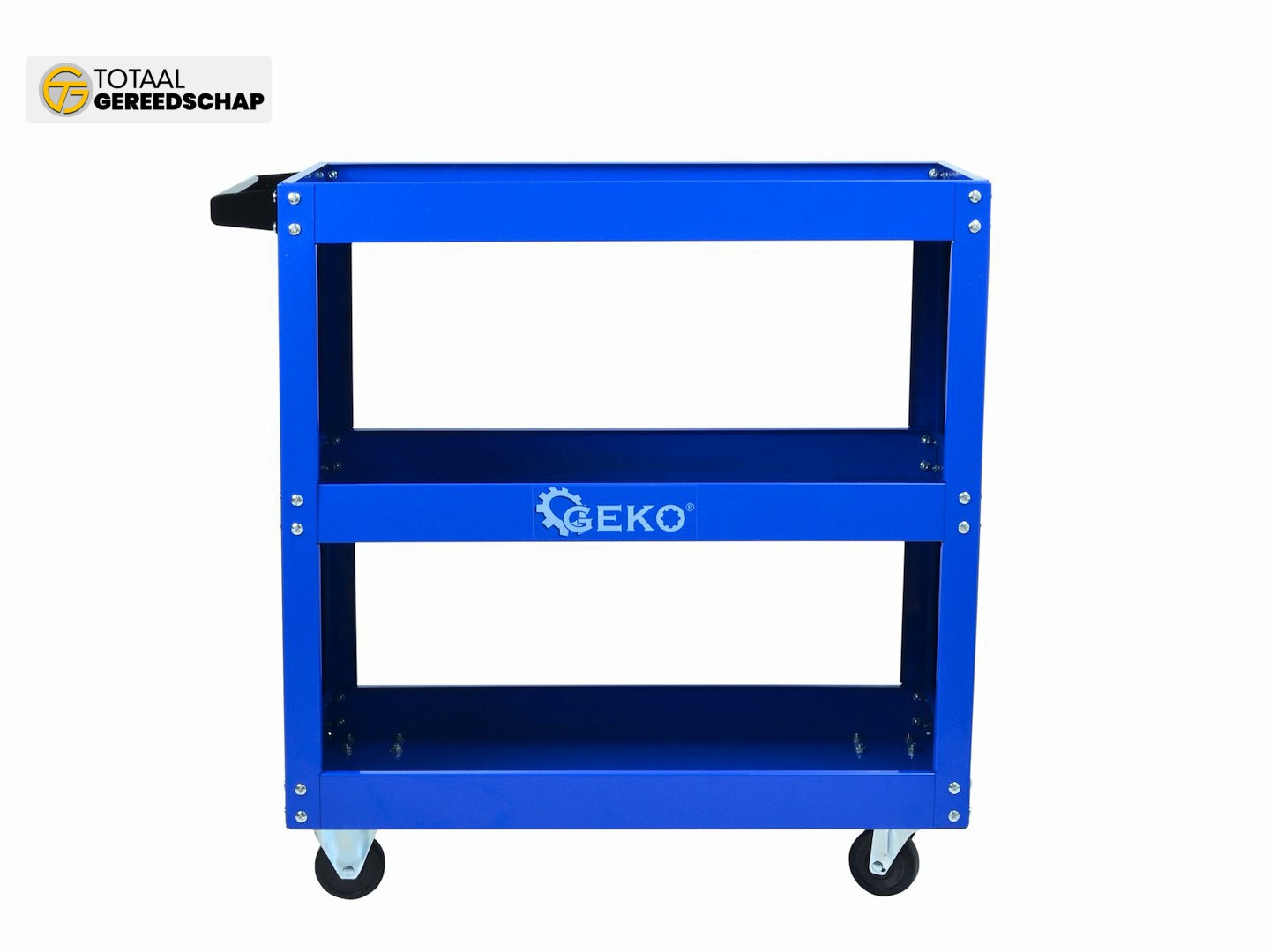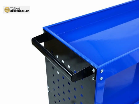 Professional workshop trolley that allows you to maintain order in the workplace. The trolley has three spacious shelves and an ergonomic handle for easy transport. In addition, it has 4 castors including 2 swivel castors (one with a brake).