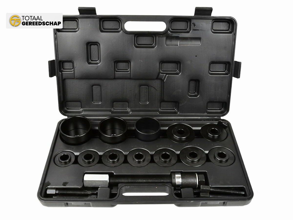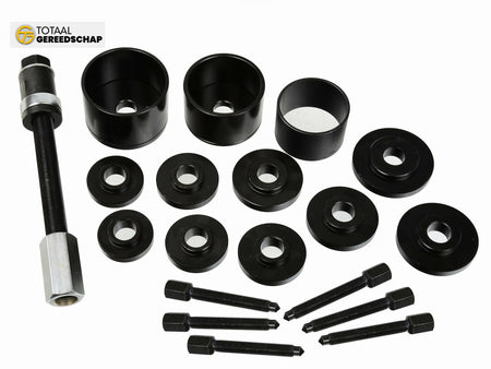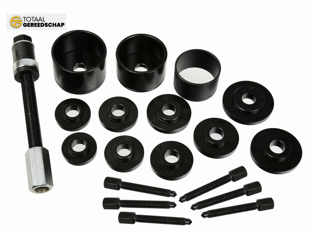 Set for mounting and dismounting front hub bearings directly on the car using a bearing screw puller.